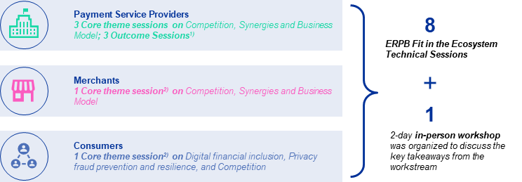 Stakeholder engagement was a cornerstone of advancing technical work on the design of the digital euro in the preparation phase. The ECB further intensified its outreach to banks and non-bank PSPs, merchants and consumers through technical sessions, workshops and bilateral meetings at expert and strategic level. Special attention was given to how the digital euro would fit into the existing European payments ecosystem, with dedicated Euro Retail Payments Board (ERPB) technical sessions to assess value drivers across the themes of competition, synergies and business model. The outcome of this work[7] showed there was consensus among market stakeholders across several topics, while on other topics there were diverging views. Key benefits identified by the ECB and all stakeholders included the following: (i) the digital euro would enhance competitiveness in the European payment landscape by strengthening the negotiating position of European PSPs and merchants; (ii) by making use of open digital euro standards, European PSPs and account-to-account (A2A) schemes can voluntarily integrate the digital euro into their payment solutions and/ or co-badge it on physical cards; (iii) the digital euro would establish a “common acceptance layer” for A2A payments, facilitating seamless transactions across point-of-sale (POS) and e-commerce platforms for European players; and (iv) a staggered roll-out approach could be considered for the introduction of the digital euro, striking an optimal balance between market relevance, the Eurosystem’s policy objectives, and technical and implementation costs. A phased roll-out of functionalities would thus enable both costs and resources to be spread over time, while focusing on essential use cases first, ensuring broad adoption and resilience.