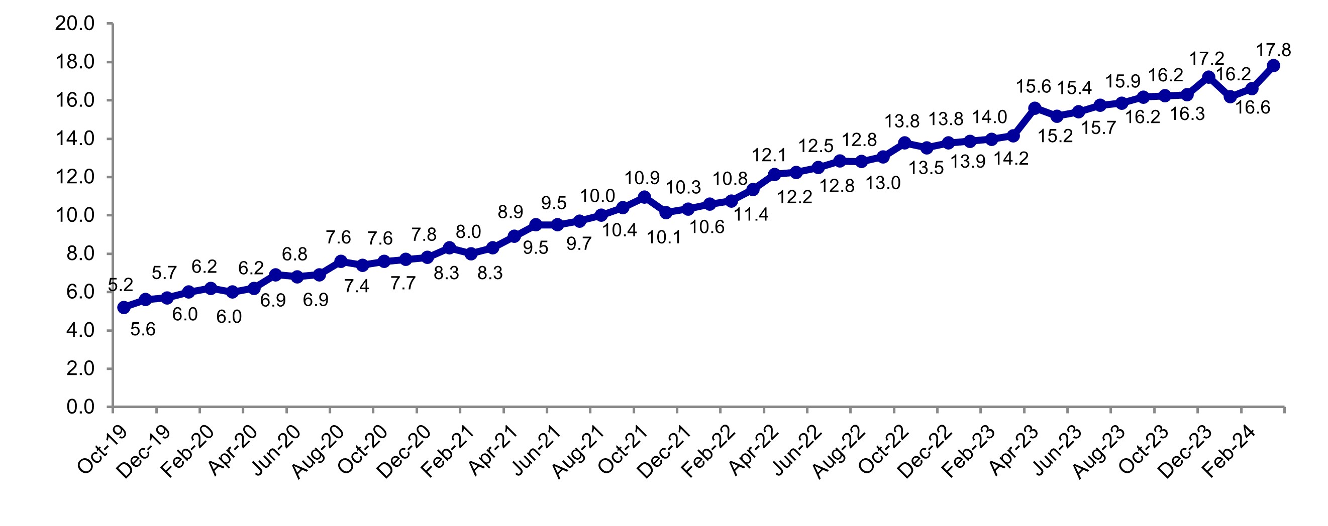 The Eurosystem monitors the use of SCT Inst via its euro area SCT Inst indicator. The indicator is calculated as the percentage of SCT Inst transactions out of all SEPA credit transfers. The data are compiled on a monthly basis and aggregated from clearing and settlement mechanisms at the end of each quarter.