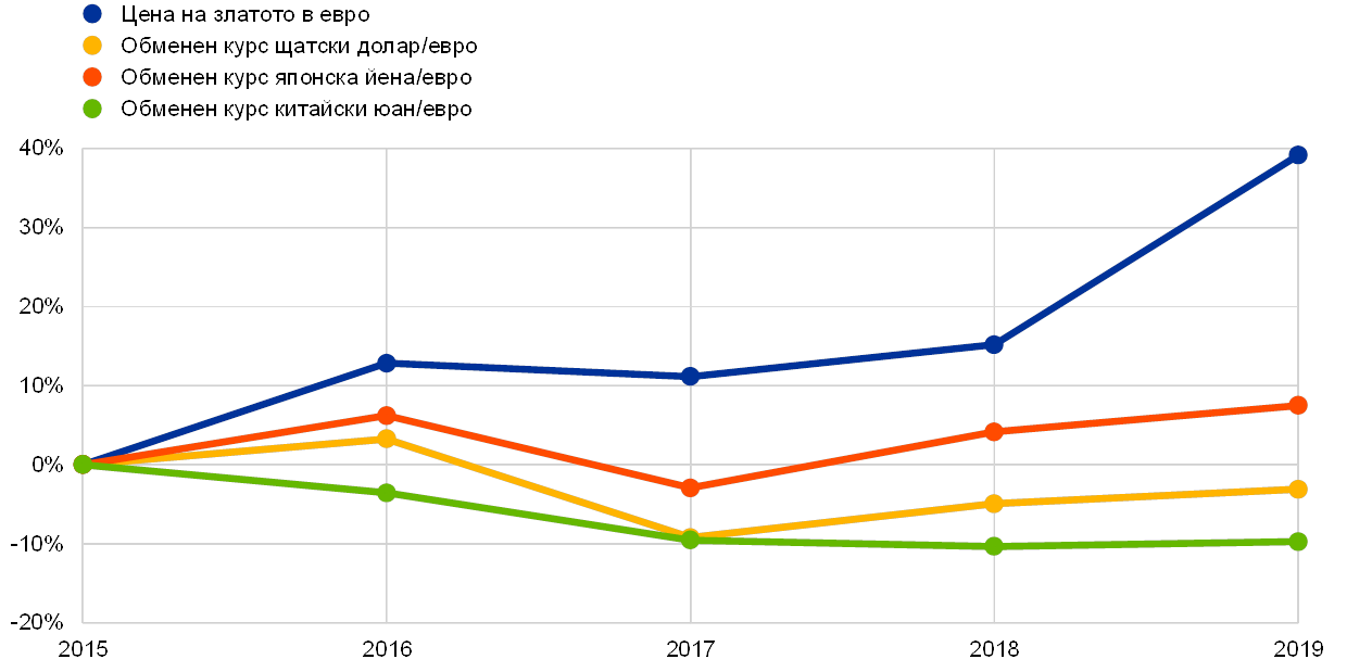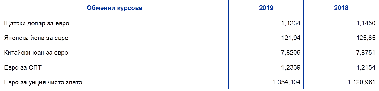 Основни валутни курсове и цена на златото през периода 2015–2019 г.