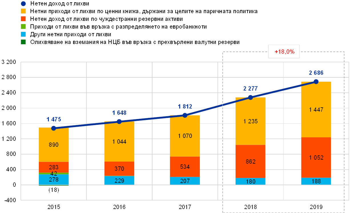 Нетният доход от лихви на ЕЦБ отбеляза увеличение с 410 млн. евро до 2686 млн. евро (виж Графика 12), главно поради по-високия доход от лихви както по чуждестранните резервни активи, така и по ценните книжа, държани за целите на паричната политика.