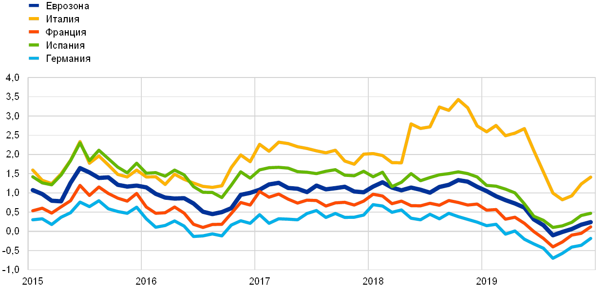 През 2019 г. нетният доход от лихви по ценни книжа, държани за целите на паричната политика, е 1447 млн. евро – с 212 млн. евро повече, отколкото през 2018 г. (виж Графика 14). Нетният доход от лихви, генериран от ценни книжа по програмата за закупуване на активи, се увеличи с 316 млн. евро до 1136 млн. евро. Нарастването произтича главно от портфейла по програмата за закупуване на активи на публичния сектор поради по-големия среден размер на наличностите и по-високата средна доходност на портфейла през годината в сравнение с 2018 г. По-специално, средната доходност по портфейла е нараснала през последните две години благодарение на i) ценните книжа с по-висока доходност, придобити през 2018 г., в сравнение със средната доходност по портфейла в ретроспективен план, и ii) реинвестирането на погашенията по главници през 2019 г. при по-висока доходност в сравнение с изплатените ценни книжа. Същевременно средната доходност по държавните облигации от еврозоната остана на ниско равнище през 2019 г. (виж Графика 15). Този по-голям нетен доход от лихви по ценни книжа, придобити по програмата за закупуване на активи, повече от компенсира спада на нетния доход от лихви по портфейлите по програмата за пазарите на ценни книжа и първата и втората програма за закупуване на обезпечени облигации. Той намаля със 104 млн. евро до 311 млн. евро поради спада в размера на тези портфейли в резултат от настъпването на падежа на ценни книжа. През 2019 г. ценните книжа, държани за целите на паричната политика, генерираха около 54% от нетния доход от лихви на ЕЦБ.