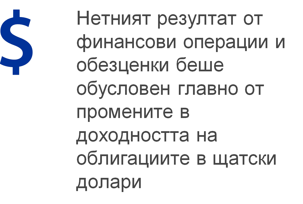 През 2019 г. бе реализирана нетна ценова печалба от продажби на ценни книжа, предимно поради ценови печалби по деноминирани в щатски долари ценни книжа, тъй като пазарната им стойност бе благоприятно повлияна от спада на доходността на облигациите в щатски долари през годината.
