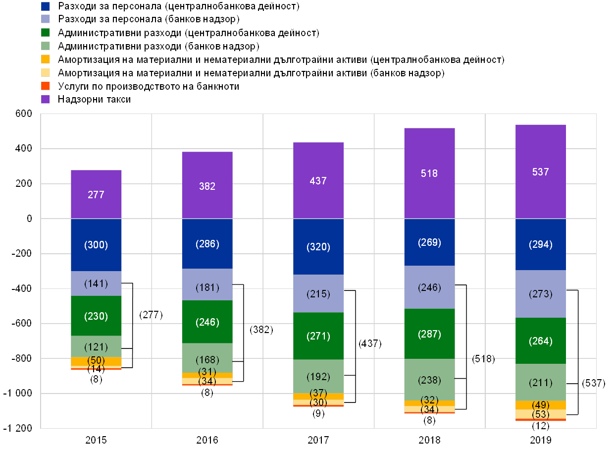 Забележки: Оперативните разходи се поделят между централнобанковата функция и банковия надзор. Между двете категории се разпределят разходите за общи услуги, които предоставят спомагателните структурни звена в ЕЦБ. Тези общи услуги се предоставят от съществуващите спомагателни структурни звена в ЕЦБ и включват сграден фонд, управление на човешките ресурси, административни услуги, бюджетиране и контрол, счетоводство, правни услуги, комуникации и преводачески услуги, вътрешен одит, статистически и ИТ услуги.