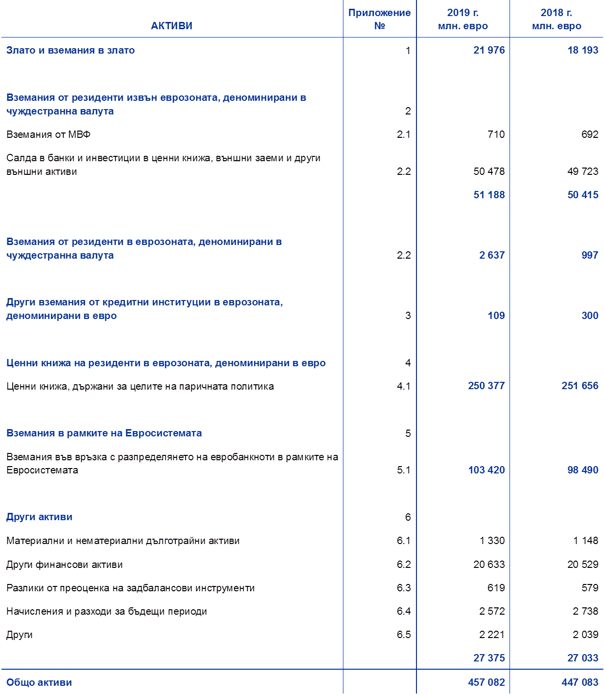 През 2019 г. общият размер на активите на ЕЦБ нарасна с 10,0 млрд. евро до 457,1 млрд. евро. Увеличението се дължи главно на i) нарастването на пазарната стойност на чуждестранните резервни активи на ЕЦБ поради поскъпването на златото и покачването на обменния курс на щатския долар и японската йена спрямо еврото в хода на годината и ii) нарастването на стойността на евробанкнотите в обращение.[5]