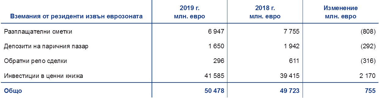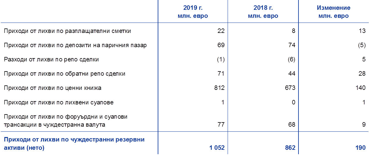 Нетният доход от лихви по чуждестранните резервни активи се увеличи със 190 млн. евро до 1052 млн. евро, главно в резултат от по-високите приходи от лихви по ценните книжа, деноминирани в щатски долари.