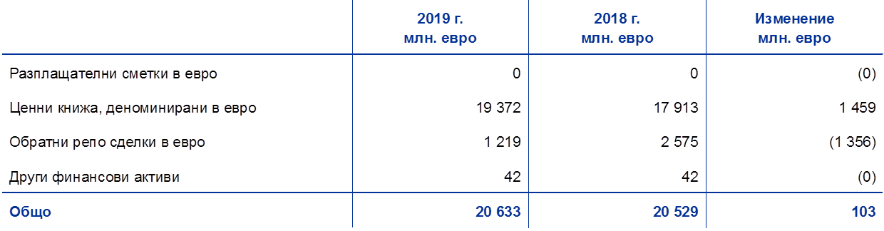 През 2019 г. общата равностойност в евро на чуждестранните резервни активи на ЕЦБ, които се състоят от злато, специални права на тираж, щатски долари, японски йени и китайски юани, се увеличи с 6,2 млрд. евро до 75,8 млрд. евро.