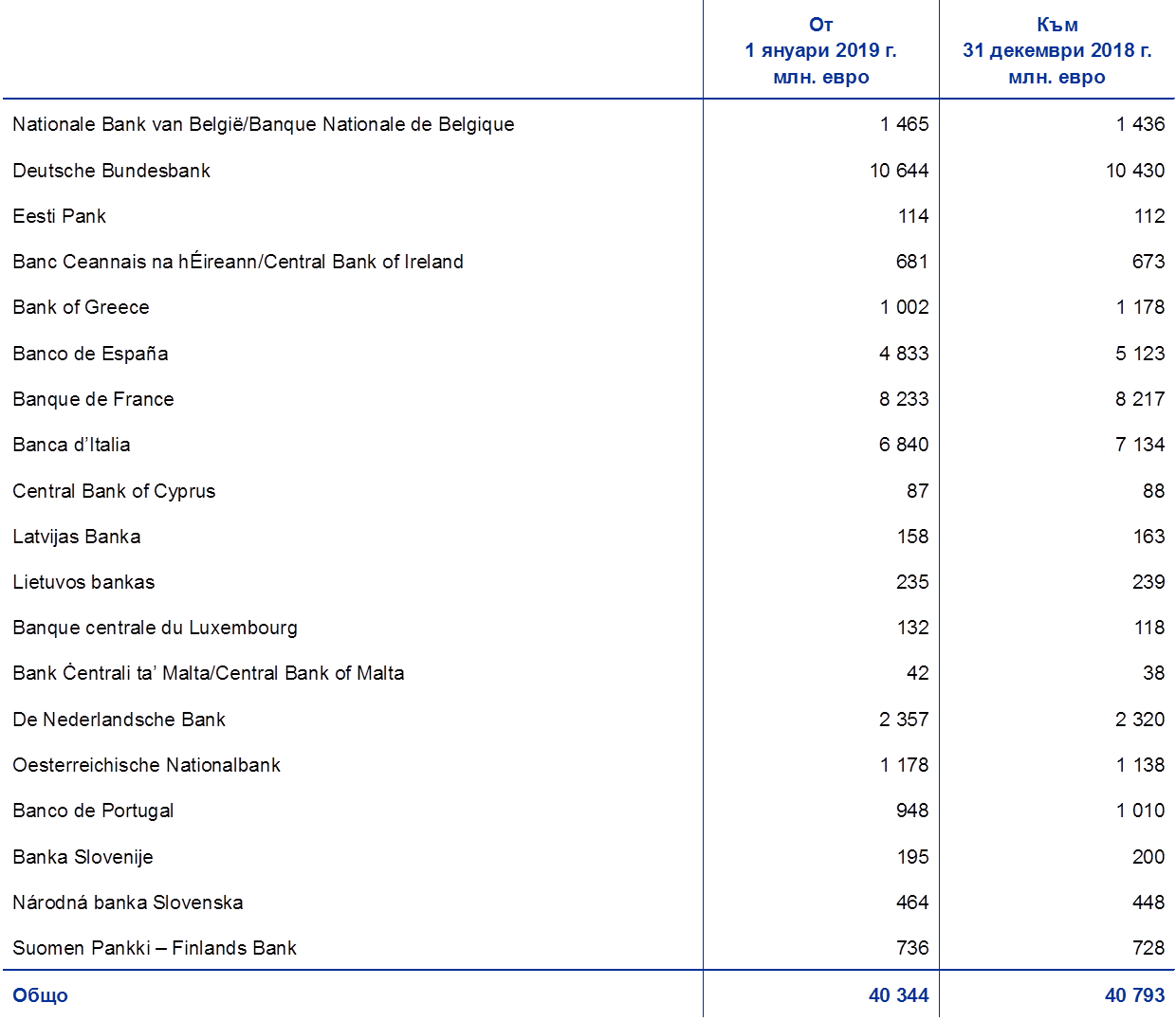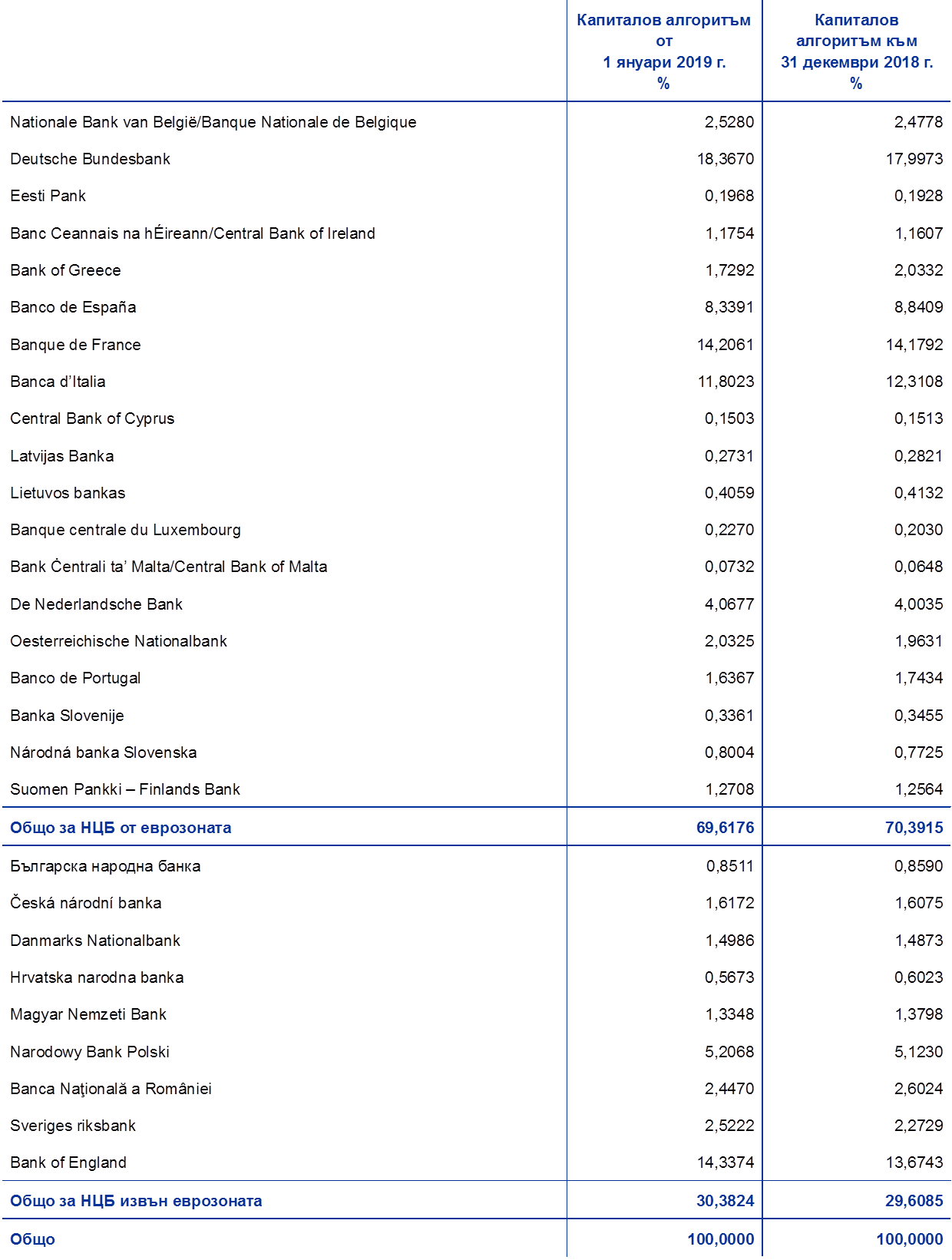 Към 31 декември 2019 г. капиталът на ЕЦБ, внесен от НЦБ от еврозоната и извън нея, възлиза на 7,7 млрд. евро – с 81 млн. евро по-малко, отколкото в края на 2018 г. Намалението произтича от петгодишната корекция на капиталовия алгоритъм на ЕЦБ, която влезе в сила на 1 януари 2019 г. и доведе до понижаване на теглото на НЦБ от еврозоната (които внасят записания си дял в пълен размер).