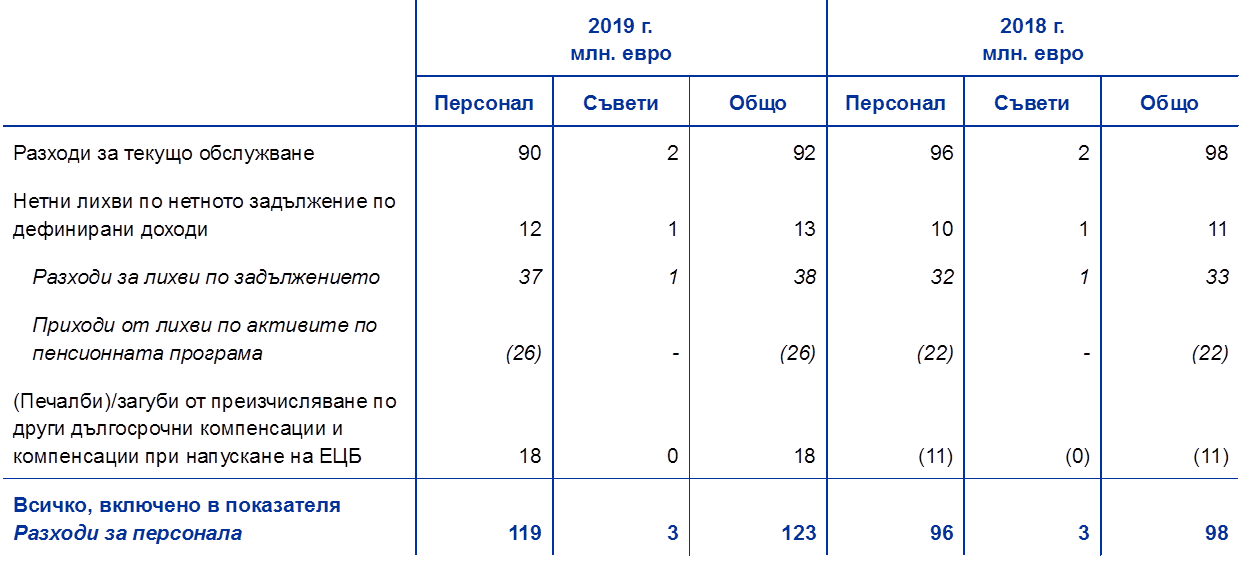 През 2019 г. разходите за персонала се увеличиха главно поради по-големия среден брой служители на ЕЦБ и по-високите разходи, свързани с други дългосрочни компенсации, в резултат най-вече от прилагането на по-нисък дисконтов процент за актюерската оценка в края на 2019 г. (виж приложение 12.3 Други).
