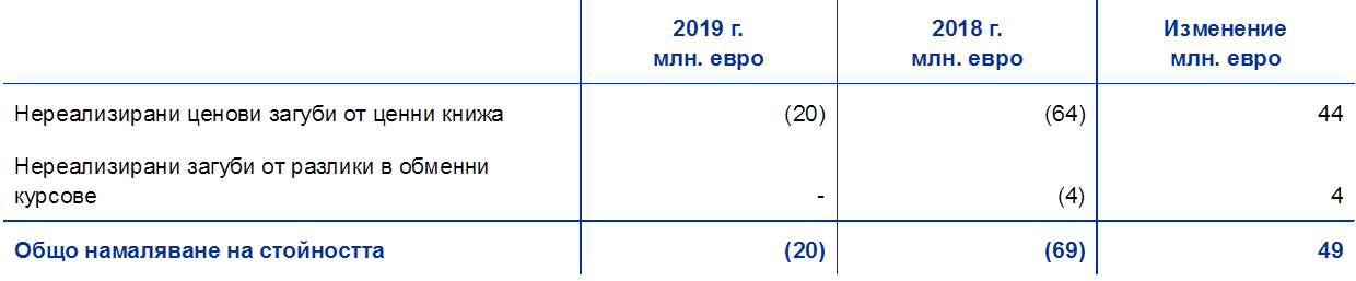 Пазарната стойност на редица ценни книжа, държани в портфейла от собствени средства и портфейла в щатски долари, спадна успоредно с покачване на съответната доходност в края на 2019 г. Това доведе до нереализирани ценови загуби в края на годината.