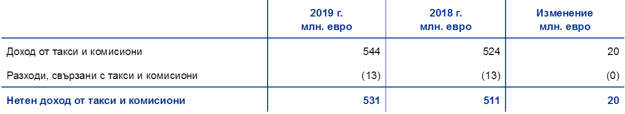 През 2019 г. доходът по този показател включваше главно надзорни такси и административни санкции, наложени на поднадзорни лица заради неспазване на разпоредбите на банковото законодателство на ЕС относно пруденциалните изисквания, включително надзорни решения на ЕЦБ. Разходът се изразяваше главно в такси за попечителски услуги.