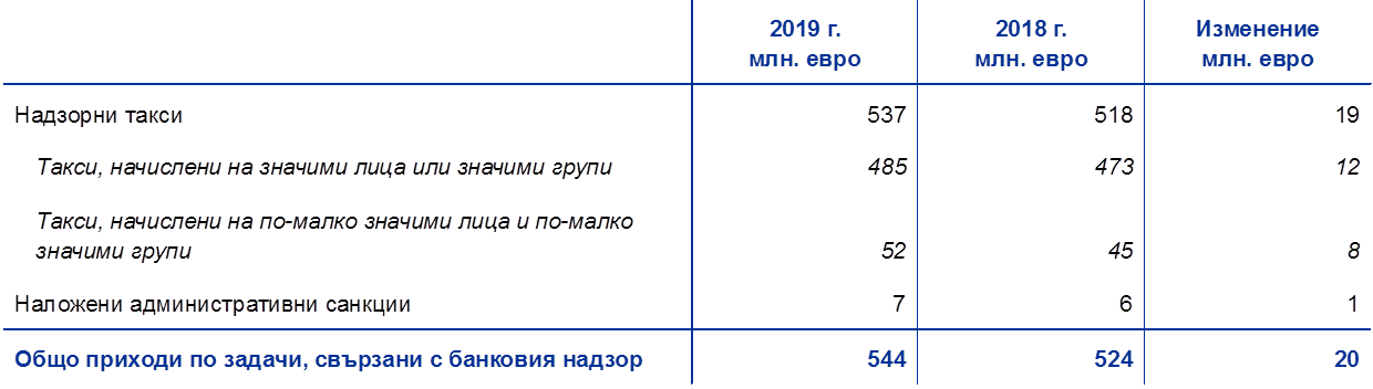 Така свързаните с надзорните задачи приходи на ЕЦБ през 2019 г. са, както следва:
