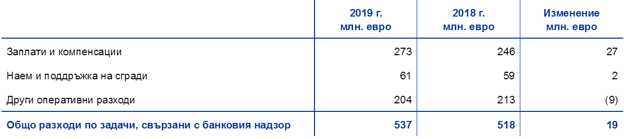 Нарасналият среден брой служители, заети в банковия надзор в ЕЦБ, доведе до съответно увеличение в заплатите и компенсациите. По-големият брой служители също така доведе до нарастване на разходите, свързани със служебни помещения, а намалението в показателя други оперативни разходи се дължеше главно на по-ниските разходи за консултантски услуги във връзка с надзорните задачи, най-вече по целевия преглед на вътрешните модели (ЦПВМ), който ще приключи през 2020 г.