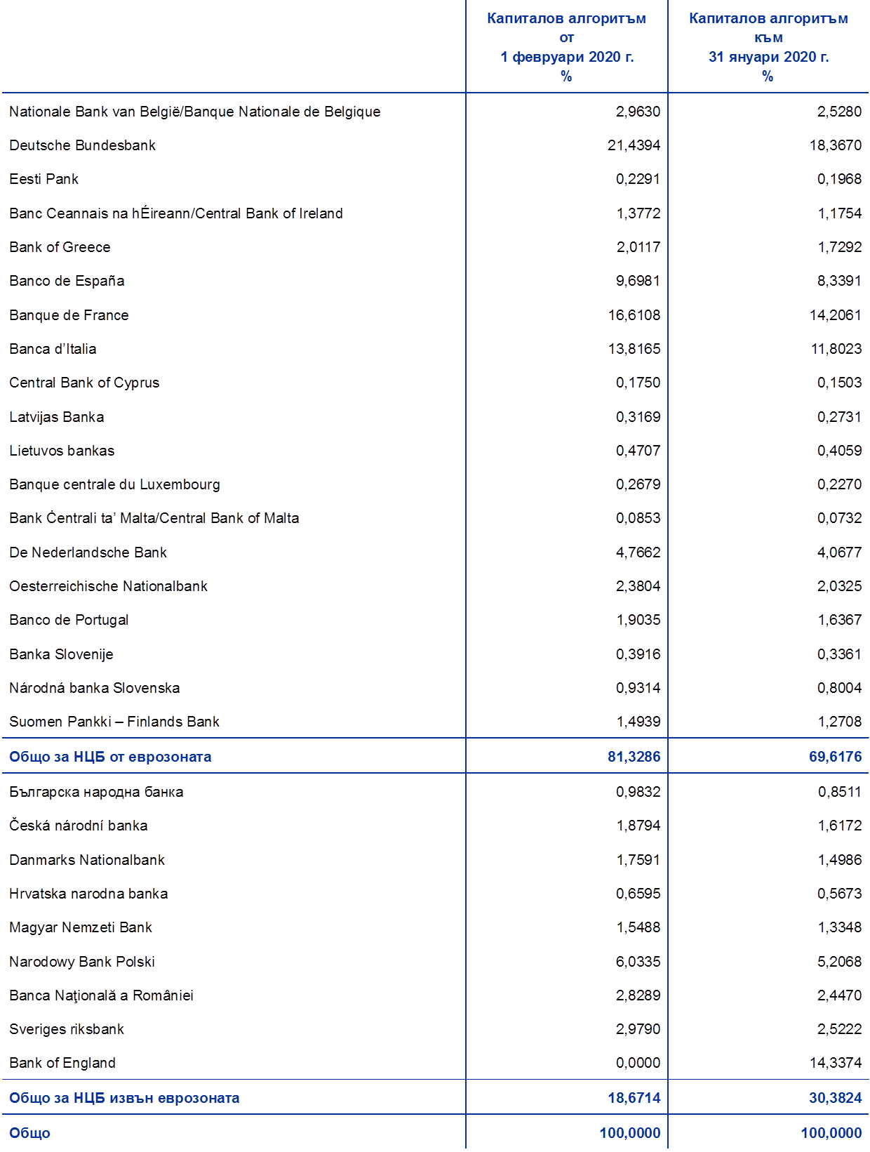 В резултат от излизането на Обединеното кралство от Европейския съюз и произтичащото от това оттегляне на Bank of England от ЕСЦБ теглата, определени на останалите НЦБ в алгоритъма за записване на капитала на ЕЦБ, бяха коригирани, считано от 1 февруари 2020 г., както следва: