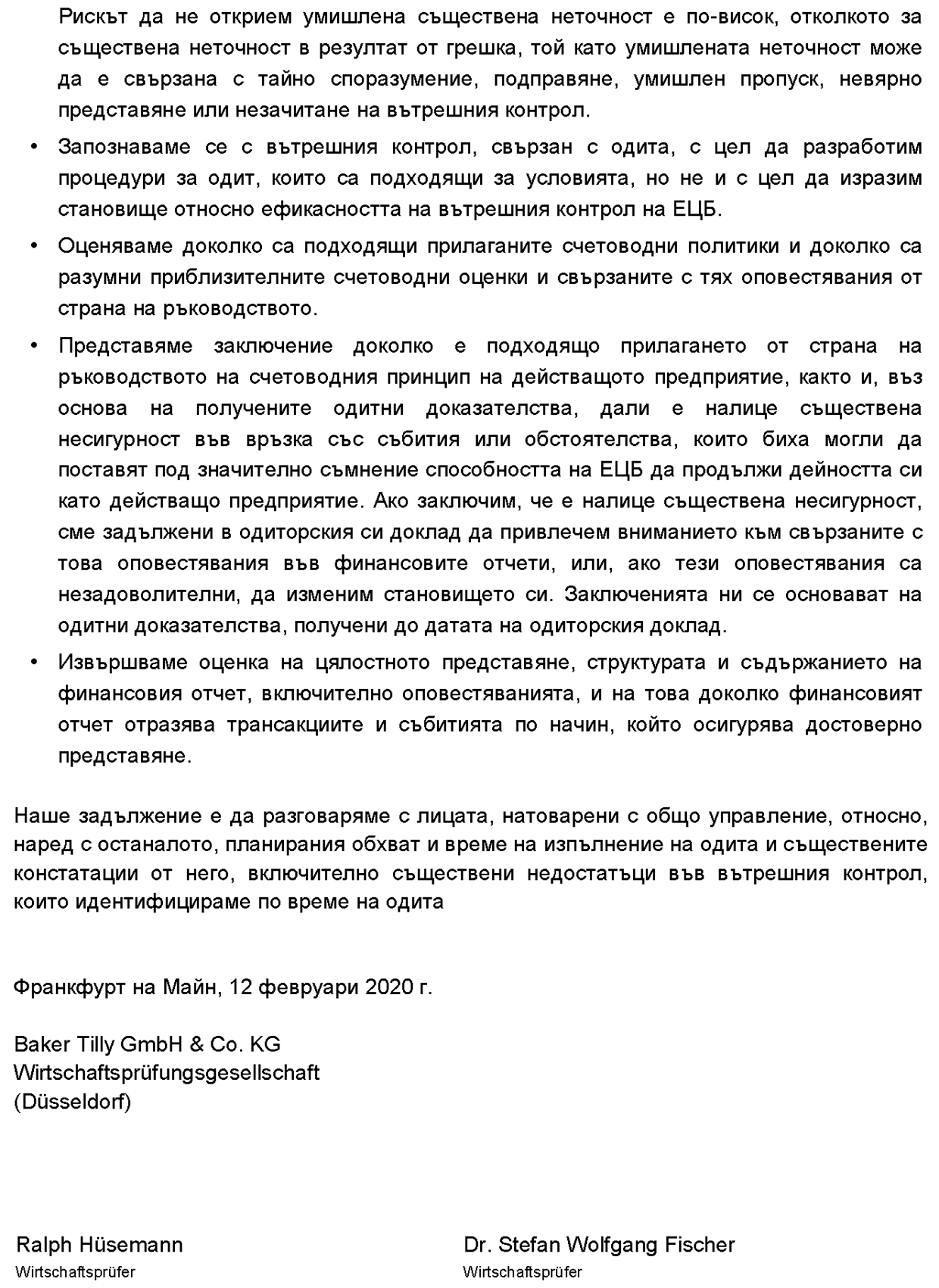 Този доклад на одитора се предоставя от ЕЦБ като неофициален превод на доклада на външния одитор на ЕЦБ. В случай на противоречие предимство има английската версия, подписана от Baker Tilly.