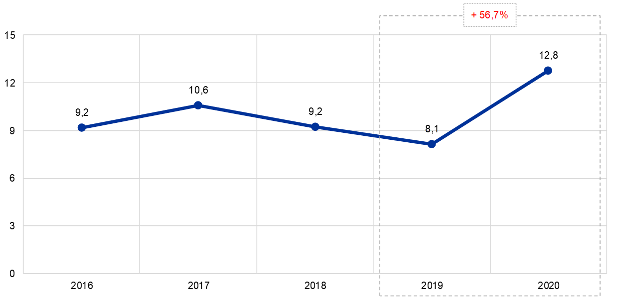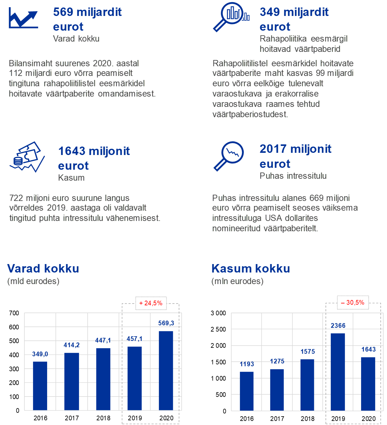 2020. aastal suurenesid EKP koguvarad 112,2 miljardi euro võrra 569,3 miljardi euroni, seda peamiselt seoses EKP osaga varaostukava (APP) ja pandeemia majandusmõjude ohjeldamise uue erakorralise varaostukava (PEPP)[6] raames tehtud väärtpaberiostudest. Ostude tulemusel toimus kasv kirjes „Rahapoliitilistel eesmärkidel hoitavad väärtpaberid”, samal ajal kui nende ostude sularahaarveldused TARGET2 kaudu tõid kaasa sama suure kasvu kirjes „Eurosüsteemisisesed kohustused”. Kasvule aitas kaasa ka ringluses olevate euro pangatähtede väärtuse tõus.