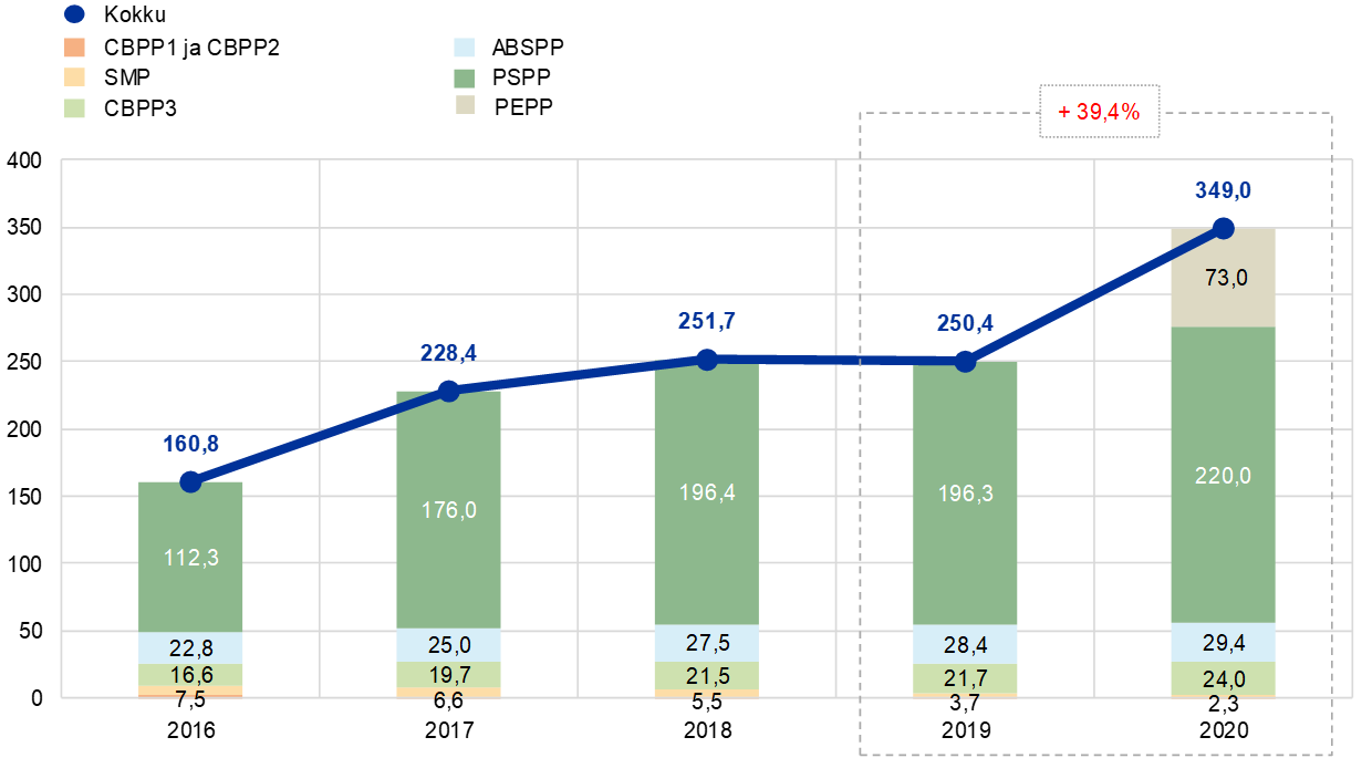 Ostude tulemusel kasvas EKP poolt rahapoliitilistel eesmärkidel hoitavate väärtpaberite portfelli maht 2020. aastal 98,6 miljardi euro võrra 349,0 miljardi euroni (vt joonis 2). Suurima panuse sellesse kasvu andsid pandeemia majandusmõjude ohjeldamise erakorralise varaostukava raames tehtud ostud. Kaetud võlakirjade esimese ja teise ostukava ning väärtpaberituruprogrammi alusel hoitavate varade väärtus vähenes seoses väärtpaberite lunastamisega ja ulatus 1,4 miljardi euroni.