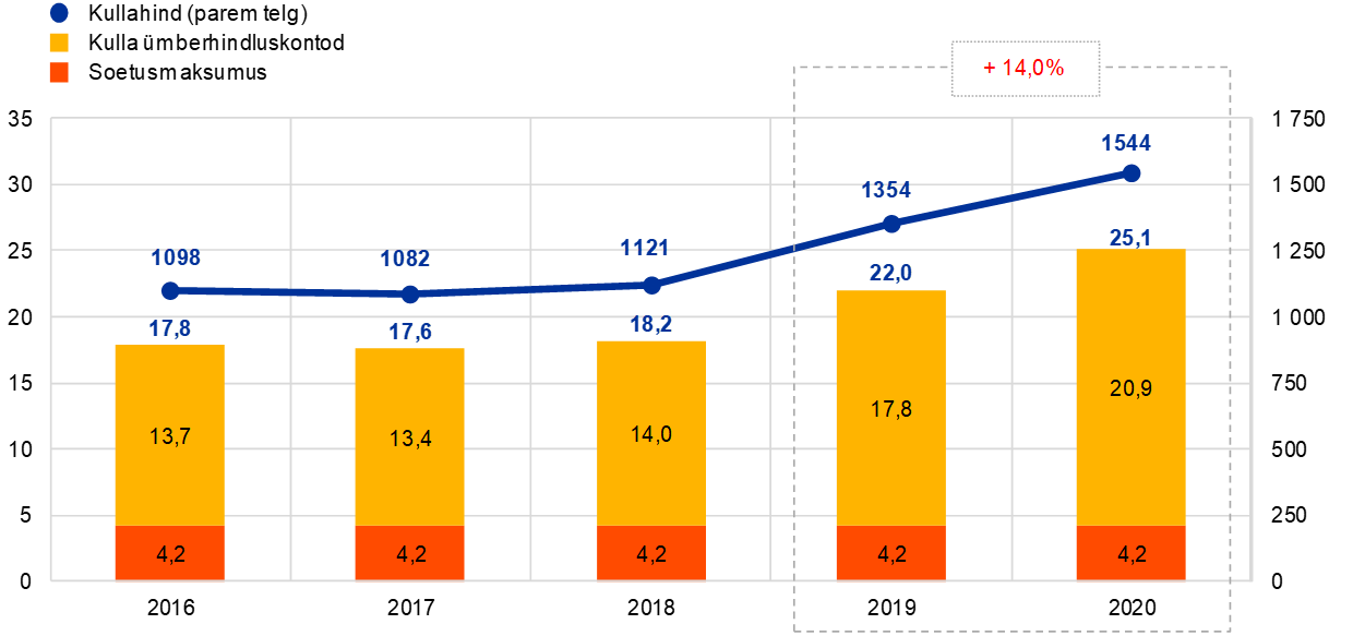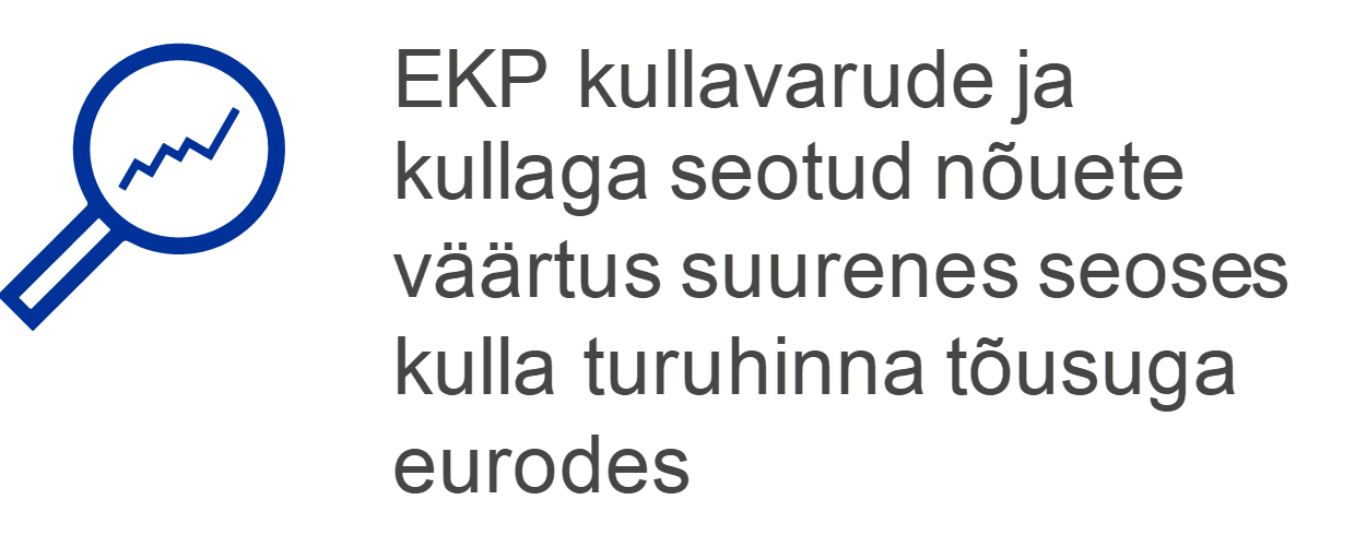 EKP kullavarude ja kullaga seotud nõuete väärtus eurodes kasvas 2020. aastal 3,1 miljardi euro võrra 25,1 miljardi euroni (vt joonis 4) seoses kulla turuhinna tõusuga eurodes. Samal ajal püsis nende varade suurus kullauntsides muutumatuna. Kõnealuste varade väärtuse kasv tõi kaasa ka EKP kulla ümberhindluskontode mahu suurenemise samas ulatuses (vt jagu 1.3.2 „Finantsvahendid”).