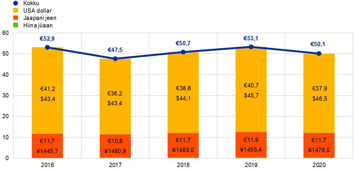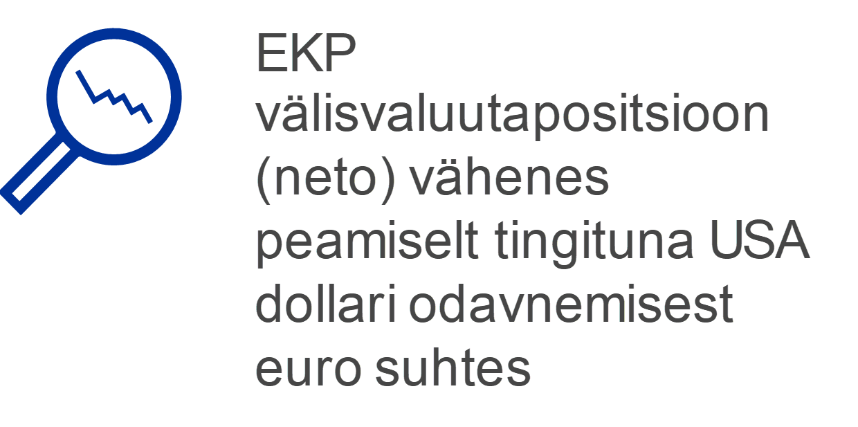 EKP välisvaluutapositsioon (neto)[12] USA dollarites, Jaapani jeenides ja Hiina jüaanides vähenes 3,0 miljardi euro võrra 50,1 miljardi euroni (vt joonis 5) valdavalt tingituna USA dollari odavnemisest euro suhtes. USA dollari odavnemine kajastub ka EKP ümberhindluskontode väiksemates saldodes (vt jagu 1.3.2 „Finantsvahendid”).