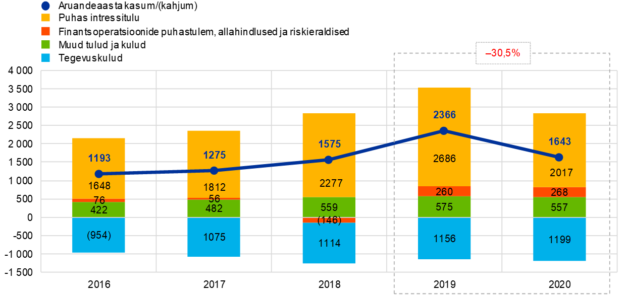 EKP aastakasum on mitme aasta vältel suurenenud tingituna välisvaluutareservidelt ja rahapoliitilistel eesmärkidel hoitavatelt väärtpaberitelt laekunud suuremast intressitulust. 2020. aastal see suundumus muutus (vt joonis 13).