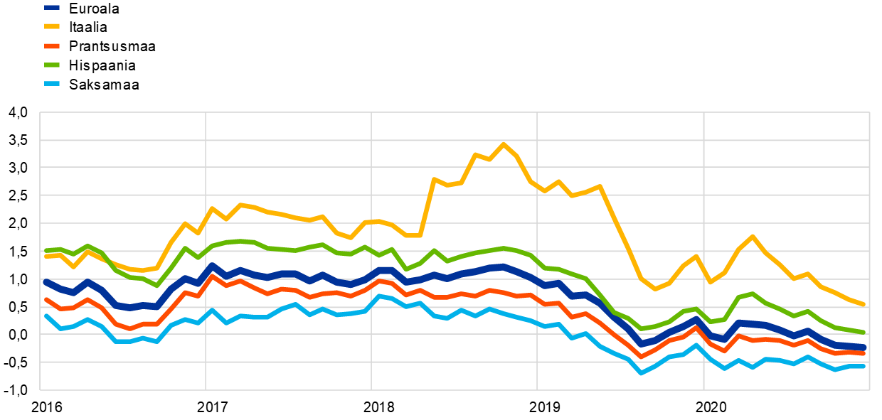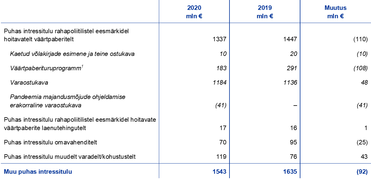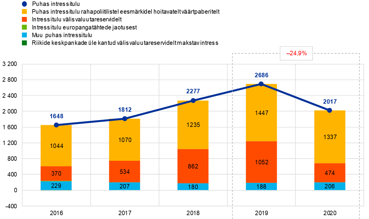 Rahapoliitilistel eesmärkidel hoitavatelt väärtpaberitelt saadud puhas intressitulu oli 2020. aastal 1337 miljonit eurot ehk 110 miljoni euro võrra väiksem kui 2019. aastal (vt joonis 16). Languse peamiseks tõukejõuks oli väärtpaberituruprogrammi ning kaetud võlakirjade esimese ja teise ostukava portfellidelt teenitud puhta intressitulu vähenemine 118 miljoni euro võrra 193 miljoni euroni seoses nende portfellide väärtuse kahanemisega väärtpaberite lunastustähtaegade saabumise tulemusel. Rahapoliitilistel eesmärkide hoitavatelt väärtpaberitelt saadud intressitulu üldist langust süvendas ka pandeemia majandusmõjude ohjeldamise erakorralise varaostukava portfellilt teenitud 41 miljoni euro suurune negatiivne puhas intressitulu. See oli tingitud omandatud avaliku sektori väärtpaberite negatiivsest keskmisest tulususest, mille põhjuseks oli euroala riigivõlakirjade madal tulusus 2020. aastal (vt joonis 17). Samal ajal suurenes varaostukava raames omandatud väärtpaberitelt saadud puhas intressitulu üksnes 48 miljoni euro võrra 1184 miljoni euroni. Selle peamiseks põhjuseks oli avaliku sektori väärtpaberite ostukava portfell, kuna selle ostukava raames varasematel aastatel omandatud varade preemiate amortisatsioon oli väiksem.[16]