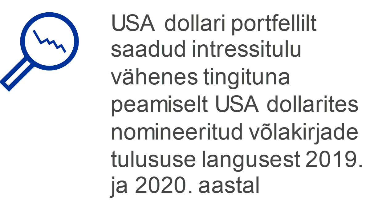 Puhas intressitulu välisvaluutareservidelt alanes 577 miljoni euro võrra 474 miljoni euroni peamiselt seoses väiksema intressituluga USA dollarites nomineeritud väärtpaberitelt. Kuna USA dollarites nomineeritud eelkõige lühiajaliste võlakirjade tulusus langes peaaegu kogu 2019. ja 2020. aasta jooksul (vt joonis 15), omandas EKP madalama tootlusega väärtpabereid, mis omakorda vähendas USA dollari portfelli keskmist tulusust võrreldes eelnenud aastaga. See mõjutas negatiivselt sellelt portfellilt 2020. aastal saadud intressitulu.