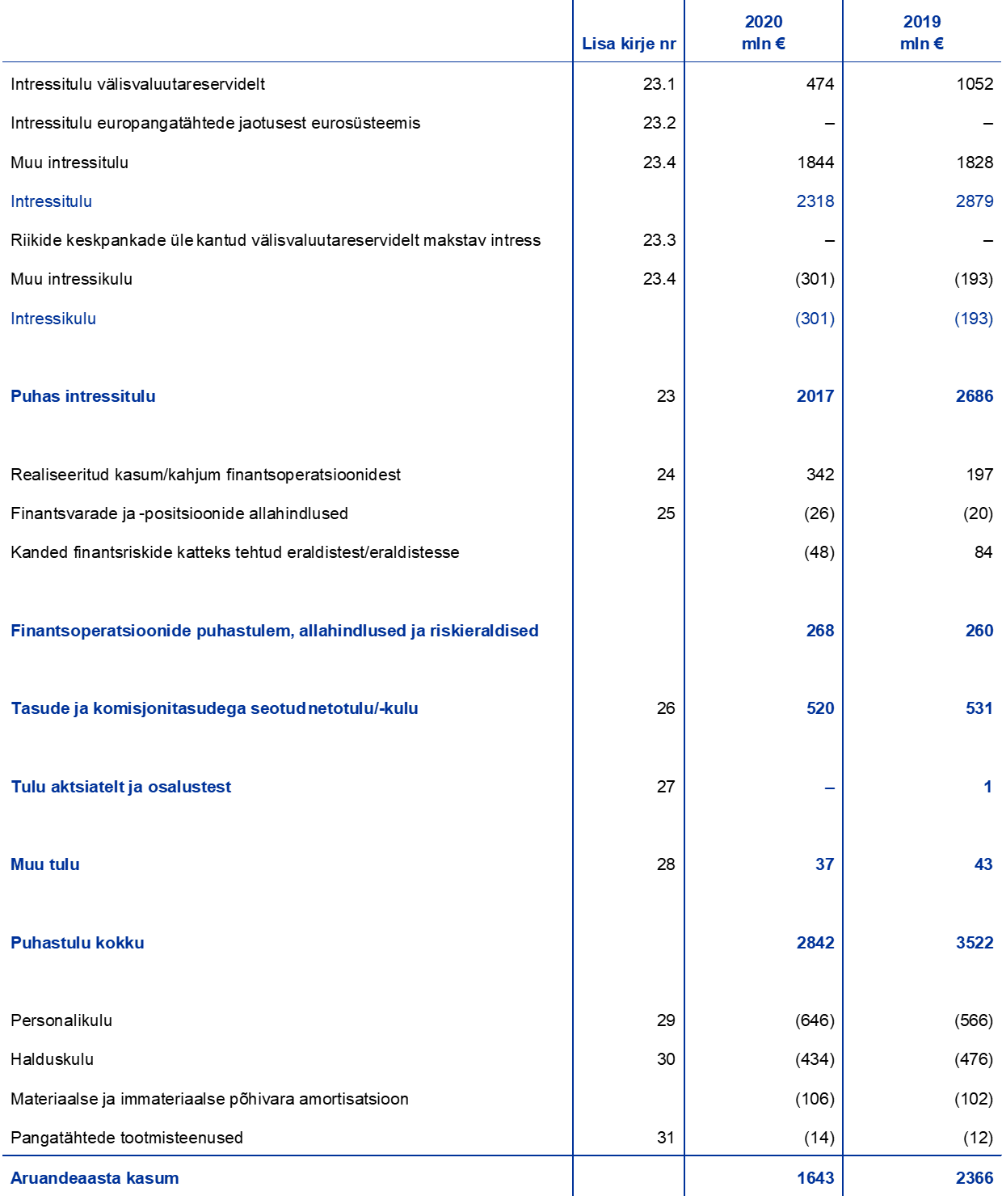 2020. aastal oli EKP kasum 1643 miljonit eurot (2019. aastal 2366 miljonit eurot). 722 miljoni euro suurune langus võrreldes 2019. aastaga oli valdavalt tingitud puhta intressitulu vähenemisest.