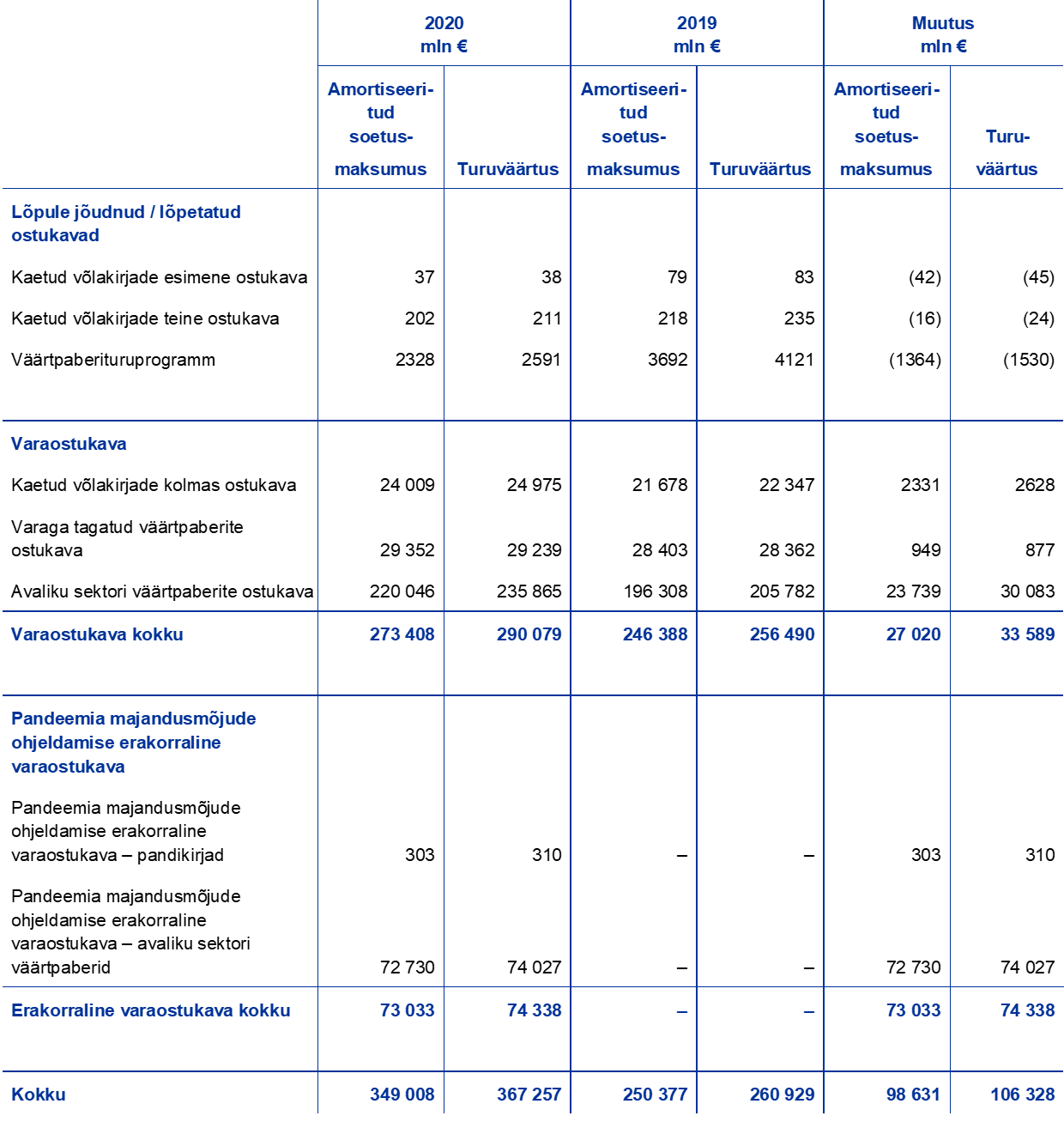2020. aastal võttis EKP nõukogu vastu mitu otsust rahapoliitilistel eesmärkidel hoitavate väärtpaberite ostude kohta, et ära hoida COVID-19 pandeemiast tulenevaid rahapoliitika ülekandemehhanismi toimimist ja euroala väljavaadet ohustavaid tõsiseid riske. Eelkõige otsustas EKP nõukogu 2020. aasta märtsis, et lisaks varaostukava raames igakuiselt 20 miljardi euro ulatuses tehtavatele ostudele tehakse kuni 2020. aasta lõpuni ajutiselt täiendavaid netovaraoste veel 120 miljardi euro ulatuses.[7] Hiljem samal kuul otsustas nõukogu alustada pandeemia majandusmõjude ohjeldamise erakorralist varaostukava esialgse mahuga 750 miljardit eurot kuni 2020. aasta lõpuni.[8] Reaktsioonina pandeemia arengule otsustas EKP nõukogu suurendada selle varaostukava mahtu 2020. aasta juunis 600 miljardi[9] ja 2020. aasta detsembris 500 miljardi[10] euro võrra. Seega moodustas pandeemia majandusmõjude ohjeldamise erakorralise varaostukava maht kokku 1850 miljardit eurot. Ühtlasi otsustas nõukogu teha selle varaostukava raames netovaraoste vähemalt kuni 2022. aasta märtsi lõpuni ning igal juhul niikaua, kuni COVID-19 levikust tingitud kriisiolukord on tema hinnangul möödas.