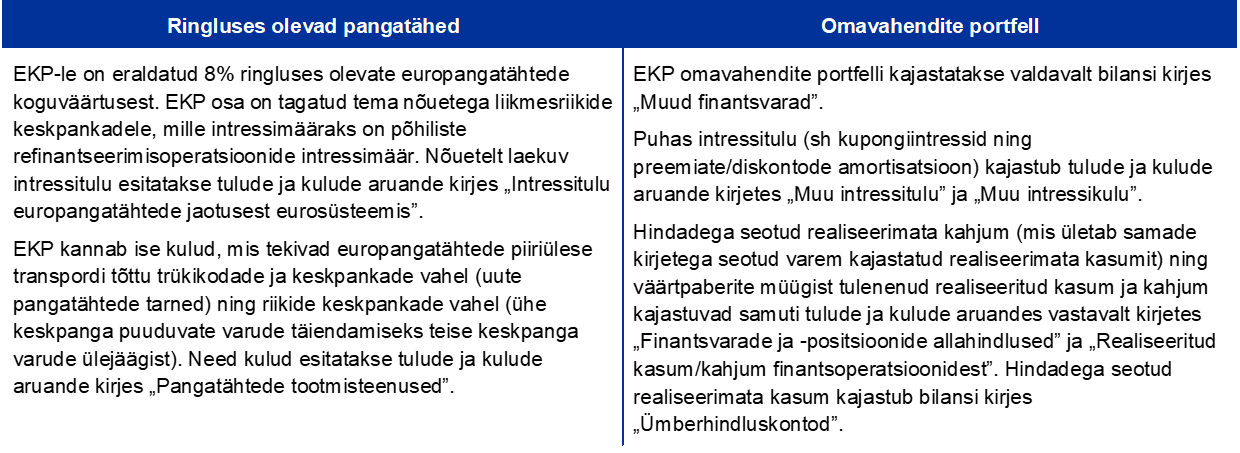 Eurosüsteemi rahapoliitilisi operatsioone kajastatakse EKP finantsaruandes ja euroala riikide keskpankade finantsaruannetes. See väljendab eurosüsteemi rahapoliitika detsentraliseeritud rakendamise põhimõtet. Tabel 1 annab ülevaate EKP ülesannete täitmiseks vajalikest põhitegevustest ja -funktsioonidest ning nende mõjust keskpanga finantsaruandele.