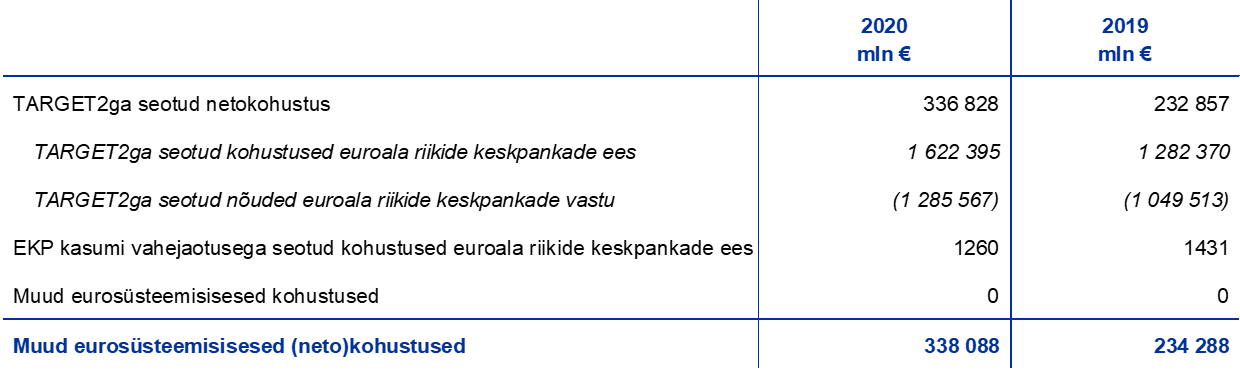 EKP eurosüsteemisisesed kohustused koosnevad peamiselt euroala riikide keskpankade TARGET2 netosaldodest EKP suhtes ja EKP kohustustest seoses eurosüsteemiga liitunud euroala riikide keskpankade üle kantud välisvaluutareservidega. Need kohustused suurenesid 2020. aastal 103,8 miljardi euro võrra 378,4 miljardi euroni. EKP eurosüsteemisiseste kohustuste suurenemist 2020. aastal ja nende arengut 2016–2019. aastal kujundasid peamiselt suundumused TARGET2ga seotud netokohustustes tingituna EKP tehtud rahapoliitilistel eesmärkidel hoitavate väärtpaberite netoostudest, mis arveldatakse TARGET2 kontode kaudu (vt joonis 10).