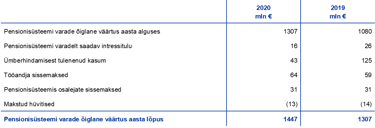 43. Pensionikava määratud väljamakse sambas kajastuvad ainult EKP ja tema töötajate kohustuslikud sissemaksed. Töötajate vabatahtlikud maksed määratud sissemaksega pensionisambasse ulatusid 2020. aastal 186 miljoni euroni (2019. aastal 171 miljonit eurot). Need maksed investeeritakse pensionikava varadesse ning nendega seoses tekib vastavalt ka sama suur kohustus.