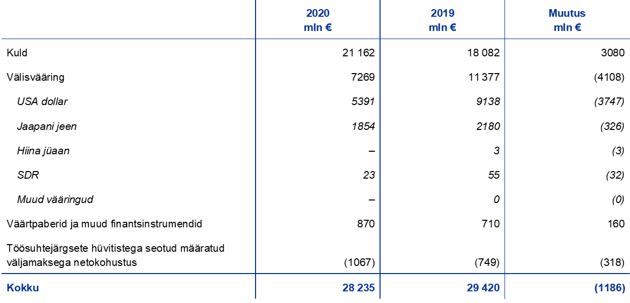 2020. aastal püsis EKP välisvaluutareservide koguväärtus peaaegu muutumatuna 75,8 miljardi euro tasemel. Välisvaluutareservide portfelli moodustavad kuld, Rahvusvahelise Valuutafondi arvestusühikud, USA dollarid, Jaapani jeenid ning Hiina jüaanid.