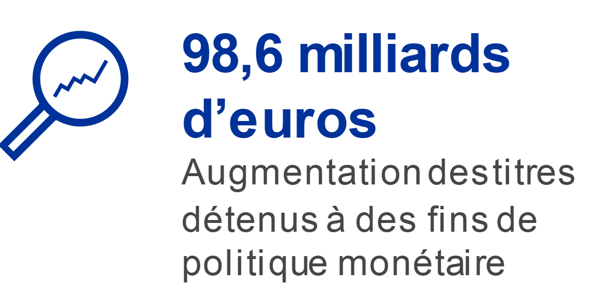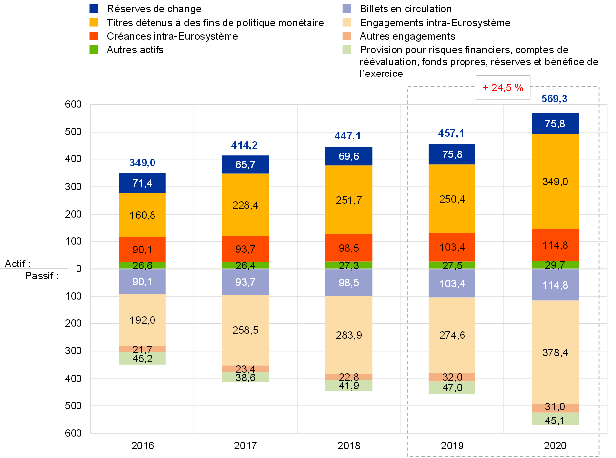 En 2020, le total des actifs de la BCE a augmenté de 112,2 milliards d’euros, à 569,3 milliards d’euros, du fait essentiellement de sa part dans les achats de titres effectués dans le cadre du nouveau programme d’achats d’urgence face à la pandémie (pandemic emergency purchase programme, PEPP)[6] et de l’APP. Ces achats se sont traduits par une hausse de la rubrique « Titres détenus à des fins de politique monétaire », alors que leur règlement en espèces à travers les comptes TARGET2 a entraîné une augmentation correspondante des « Engagements intra-Eurosystème ». L’augmentation de la valeur des billets en euros en circulation a aussi contribué à cette hausse.
