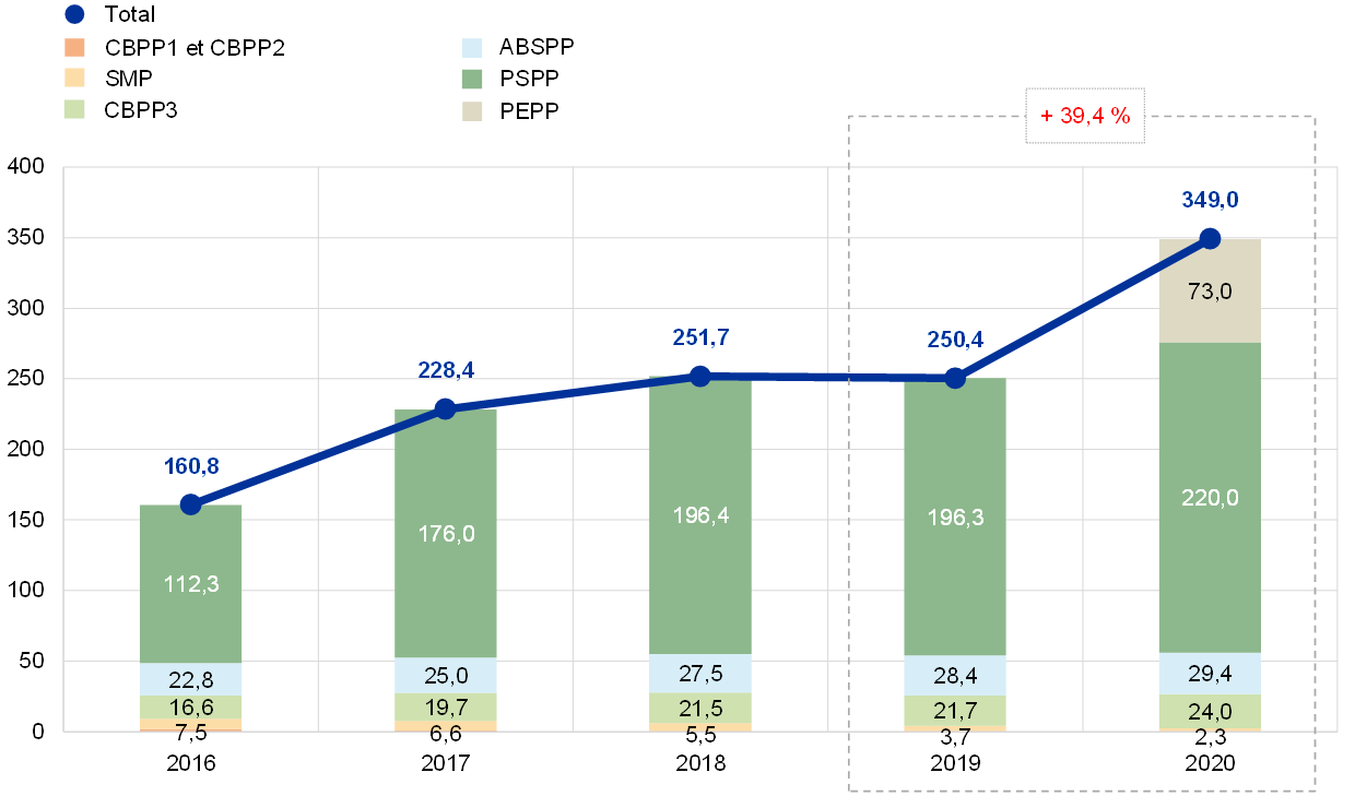 Par conséquent, le portefeuille de titres détenus par la BCE à des fins de politique monétaire s’est accru de 98,6 milliards d’euros, à 349,0 milliards d’euros en 2020 (graphique 2), cette hausse découlant principalement des achats effectués dans le cadre du PEPP. La baisse des avoirs au titre du SMP, du CBPP1 et du CBPP2 s’explique par des remboursements à hauteur de 1,4 milliard d’euros.