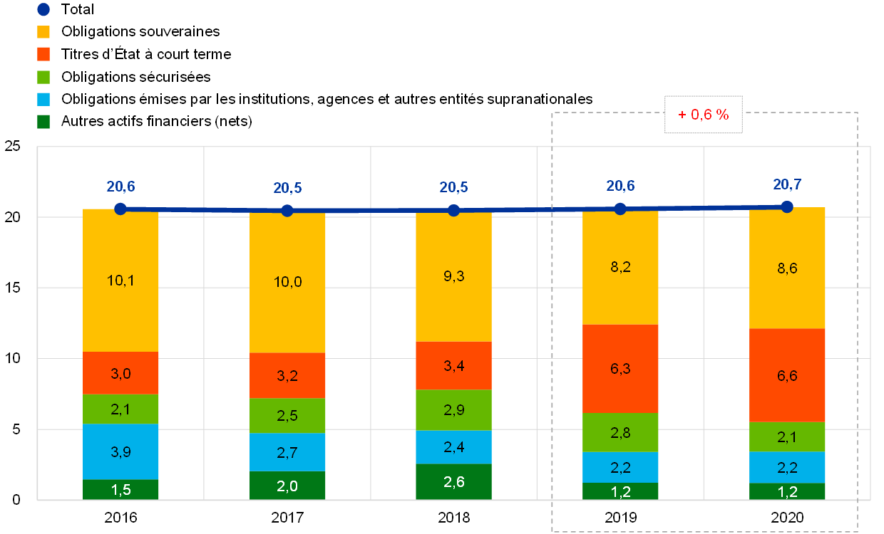 En 2020, la valeur du portefeuille de fonds propres a progressé de 0,1 milliard d’euros, à 20,7 milliards d’euros (graphique 8), principalement sous l’effet du réinvestissement des produits d’intérêts et de la hausse de la valeur de marché des titres détenus dans ce portefeuille. Ce portefeuille se compose principalement de titres libellés en euros valorisés aux prix du marché en fin d’exercice. En 2020, les titres de créance des administrations publiques ont représenté 73 % de l’ensemble du portefeuille.