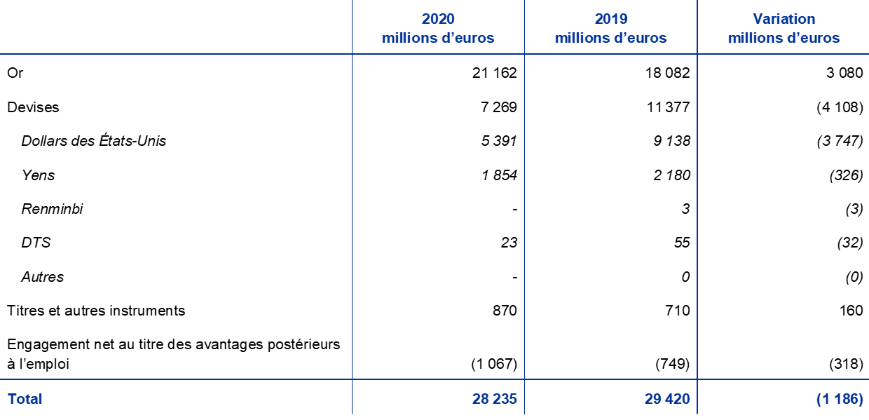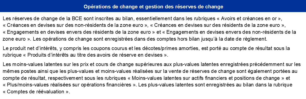 Note : Les « Comptes de réévaluation » comprennent les plus-values de réévaluation totales sur les avoirs en or, en devises et en titres, à l’exclusion du compte de réévaluation relatif aux avantages postérieurs à l’emploi.