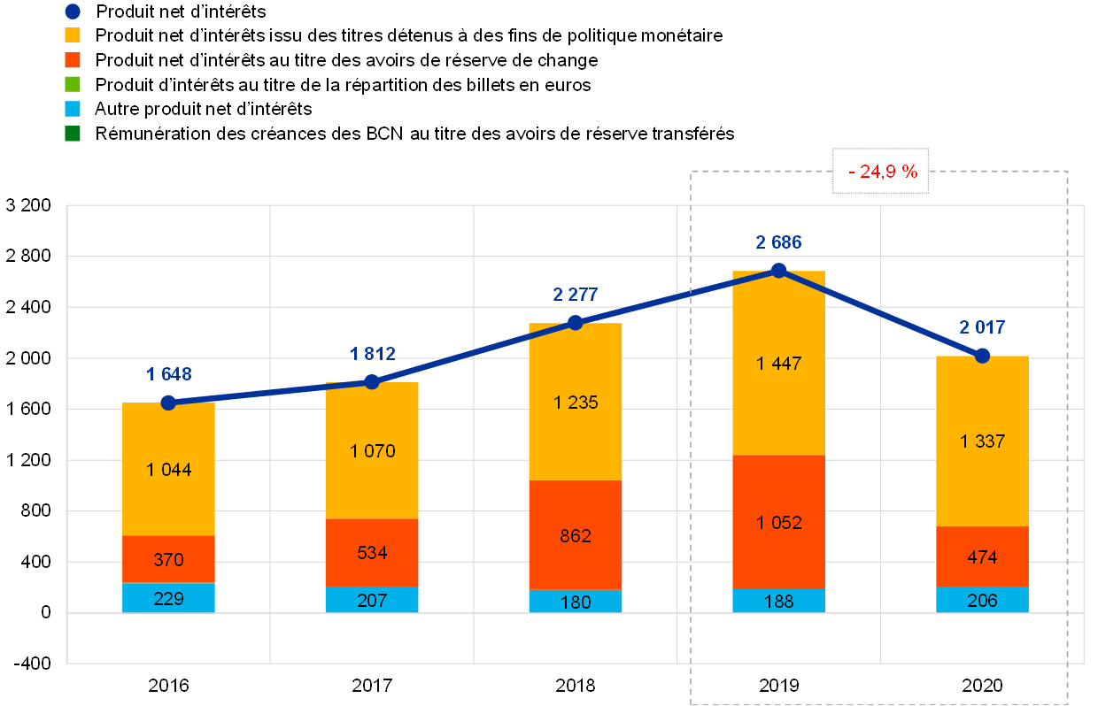 En 2020, le bénéfice de la BCE s’est établi à 1 643 millions d’euros, contre (contre 2 366 millions en 2019). La baisse de 722 millions d’euros par rapport à 2019 découle principalement de la baisse des produits d’intérêts nets.