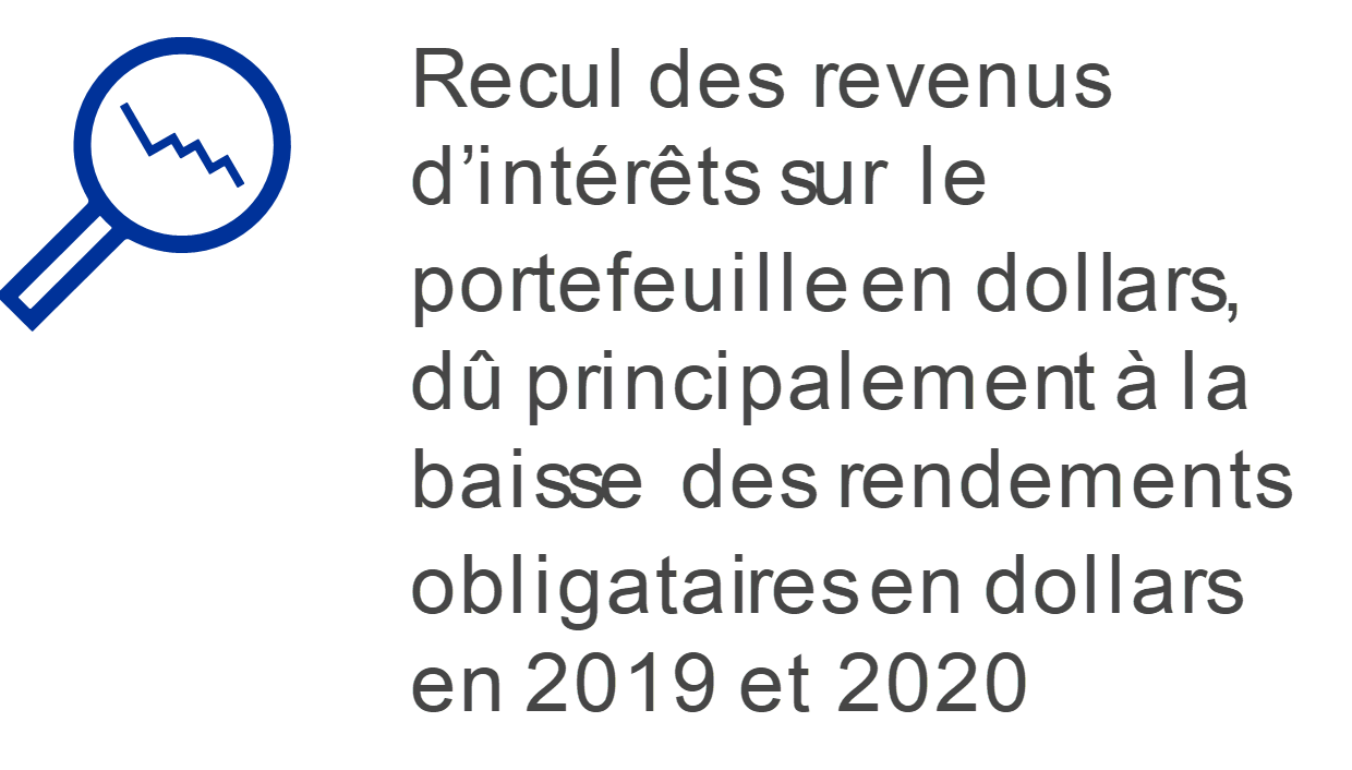 Le produit net d’intérêts au titre des avoirs de réserve de change s’est contracté de 577 millions d’euros, à 474 millions d’euros, principalement du fait de la baisse des revenus d’intérêts provenant des titres libellés en dollars. En raison de la diminution tendancielle des rendements des obligations libellées en dollars pendant la majeure partie de 2019 et 2020 (graphique 15), en particulier pour les échéances courtes, la BCE a acheté des titres à rendement plus faible, le rendement moyen de son portefeuille libellé en dollars étant ainsi inférieur à l’année précédente. Cette évolution a eu une incidence négative sur les intérêts perçus sur ce portefeuille en 2020.