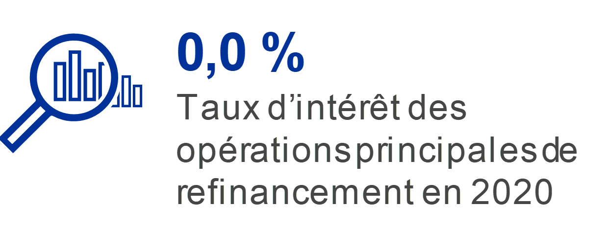 - Depuis le 16 mars 2016, le taux d’intérêt appliqué par l’Eurosystème à ses appels d’offres dans le cadre des opérations principales de refinancement est de 0,00 %.