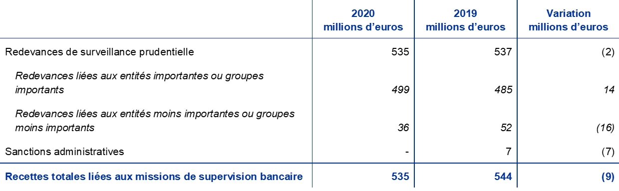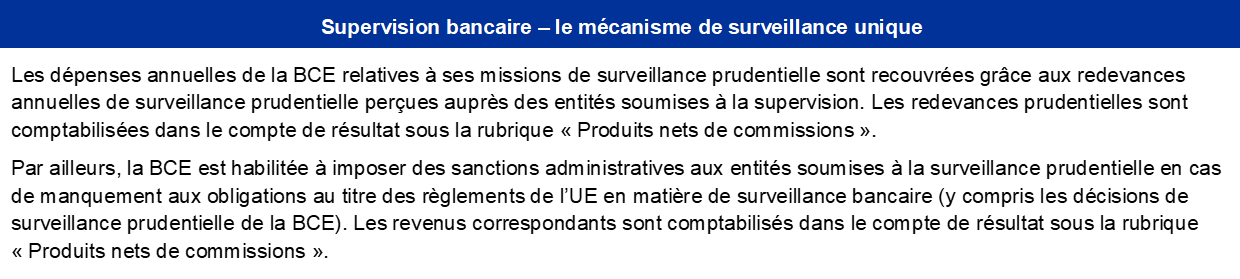 - Les dépenses engagées par la BCE pour l’accomplissement de ses missions de surveillance prudentielle sont recouvrées grâce aux redevances annuelles perçues auprès des entités soumises à la supervision. Des informations supplémentaires sont disponibles sur le site Internet de la BCE.