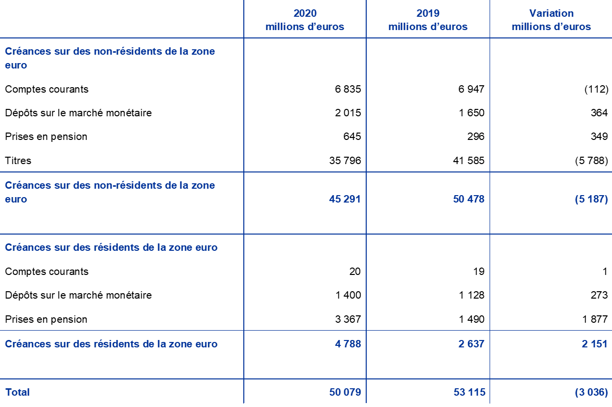 - Avoirs comprenant des actifs inscrits au bilan dans les rubriques « Créances en devises sur des non-résidents de la zone euro – Comptes auprès des banques, titres, prêts et autres actifs en devises » et « Créances en devises sur des résidents de la zone euro ».