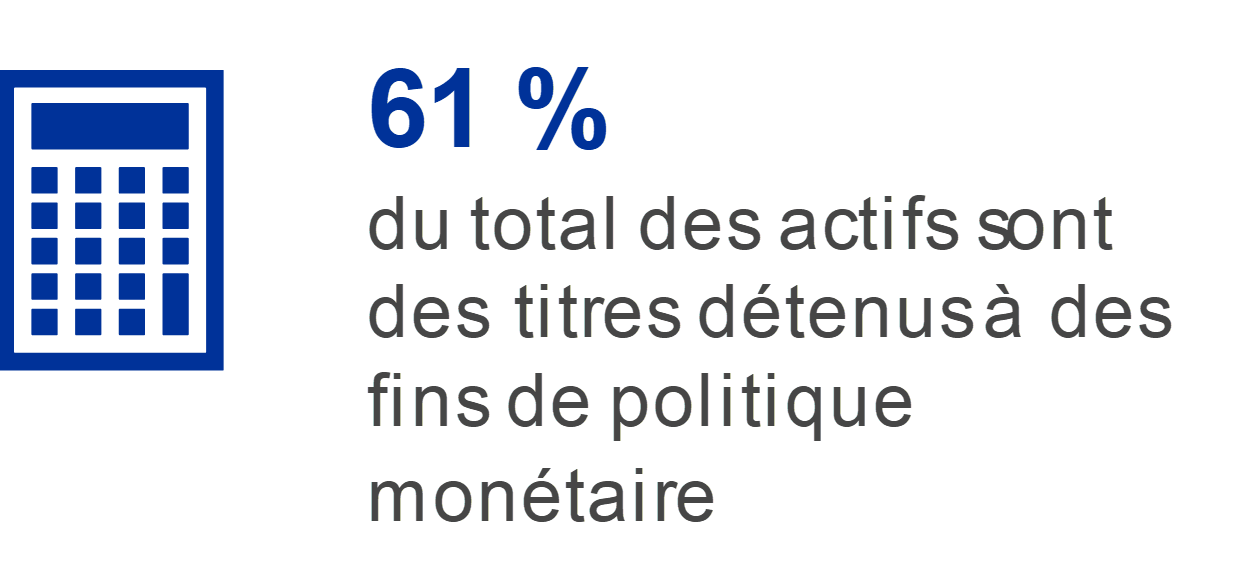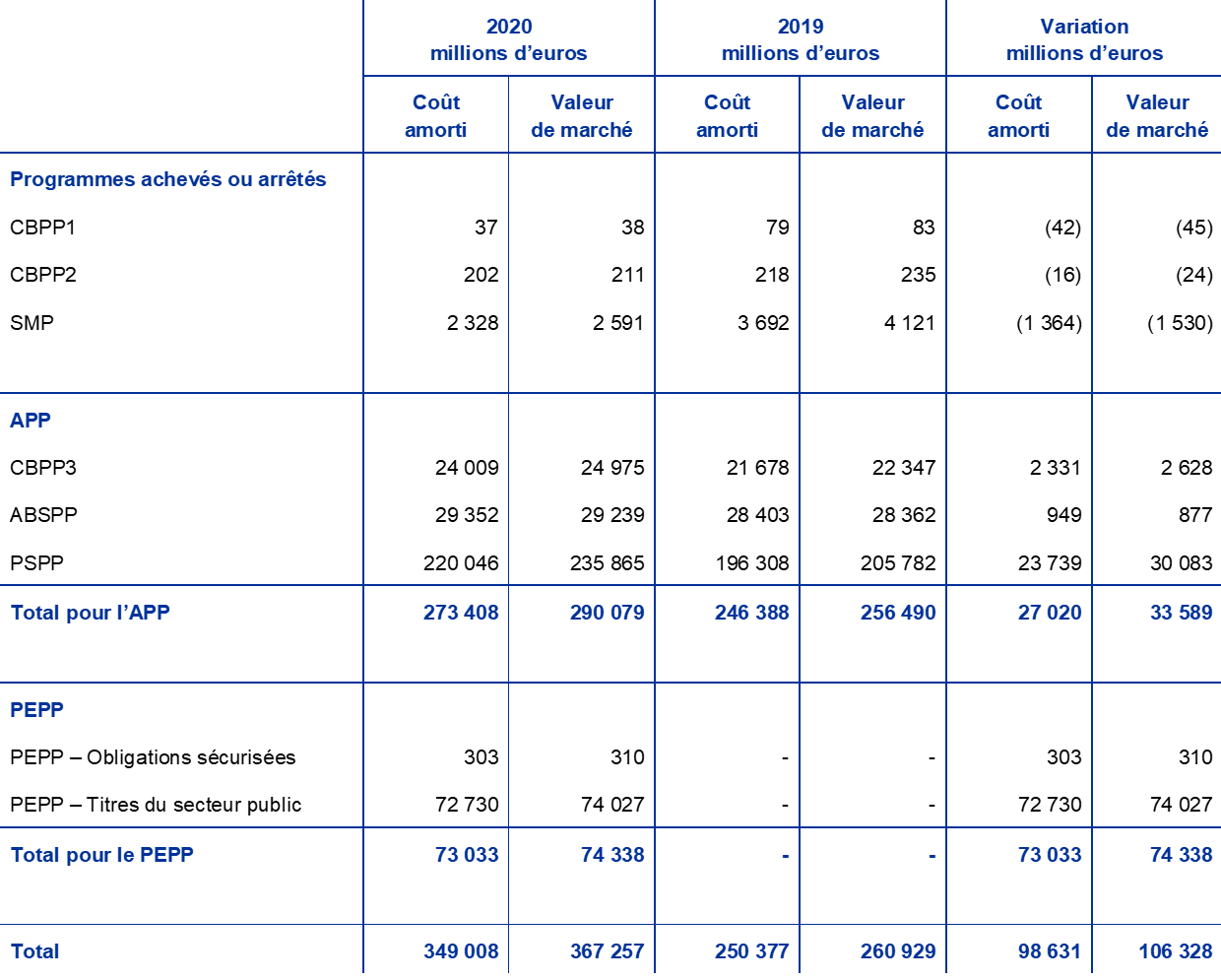 Les titres libellés en euros détenus à des fins de politique monétaire représentaient 61 % du total des actifs de la BCE à la fin de 2020. Cette rubrique du bilan de la BCE comprend les titres acquis en vertu du Programme pour les marchés de titres (Securities Markets Programme, SMP), des trois programmes d’achats d’obligations sécurisées (CBPP1, CBPP2 et CBPP3), de l’ABSPP, du PSPP et du PEPP.