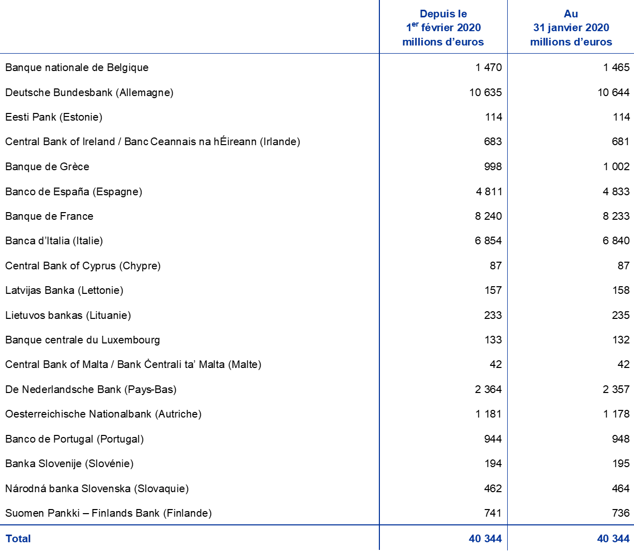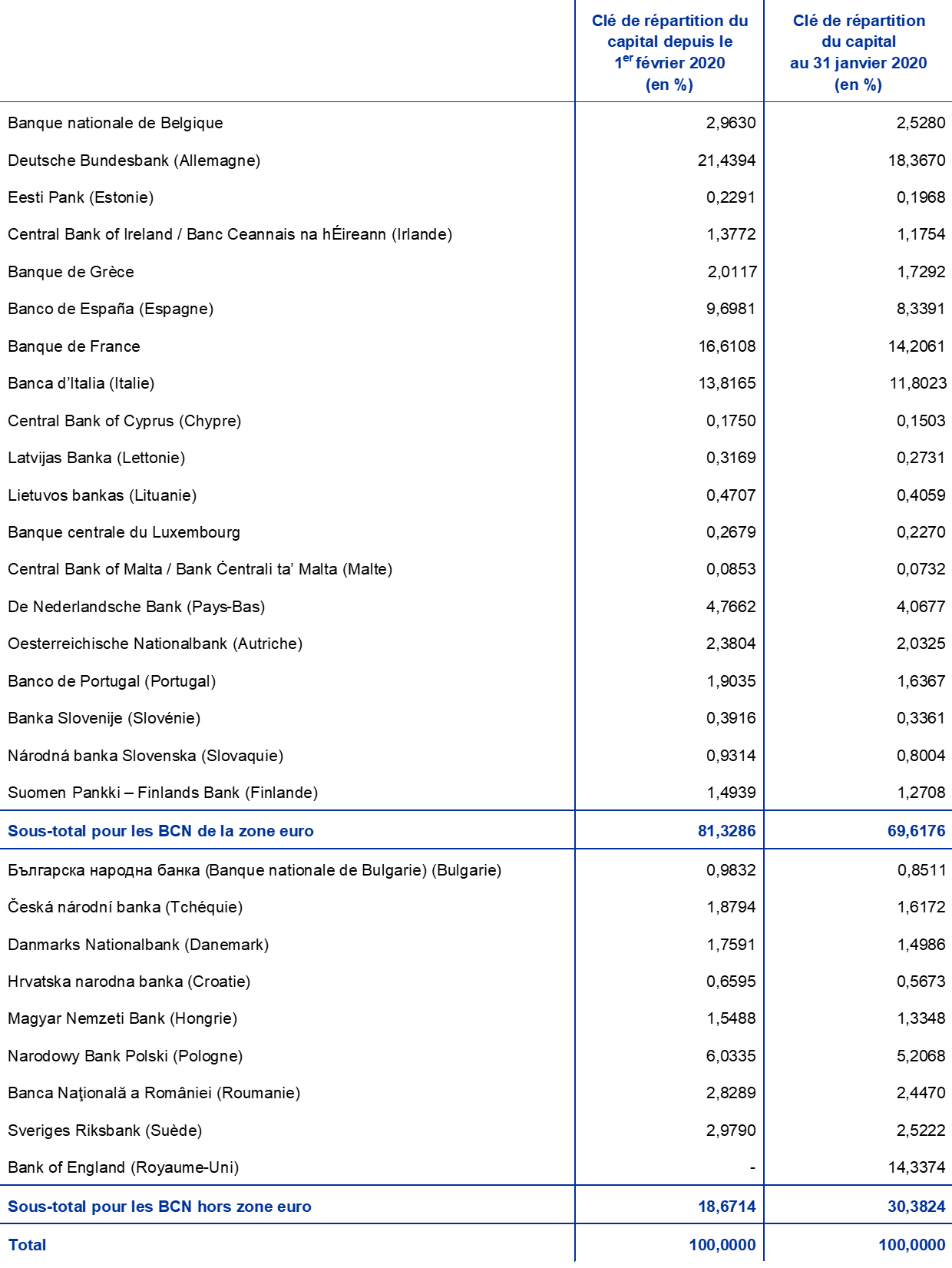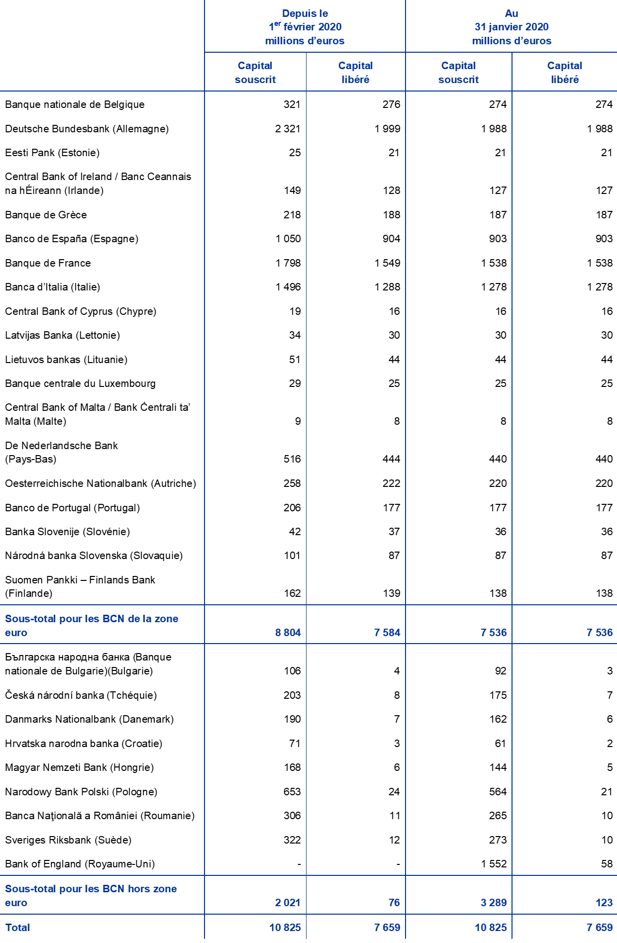 - Cf. communiqué de presse du 30 janvier 2020 sur le capital souscrit de la BCE à la suite du retrait de la Banque d’Angleterre du SEBC.