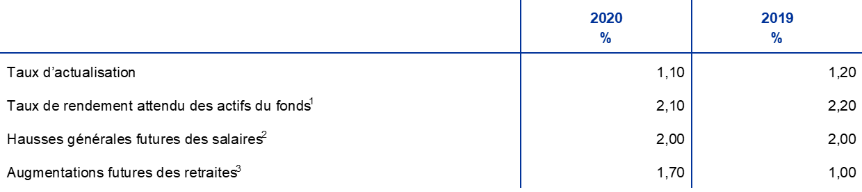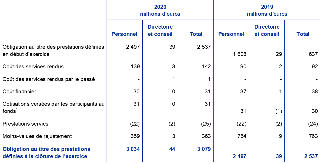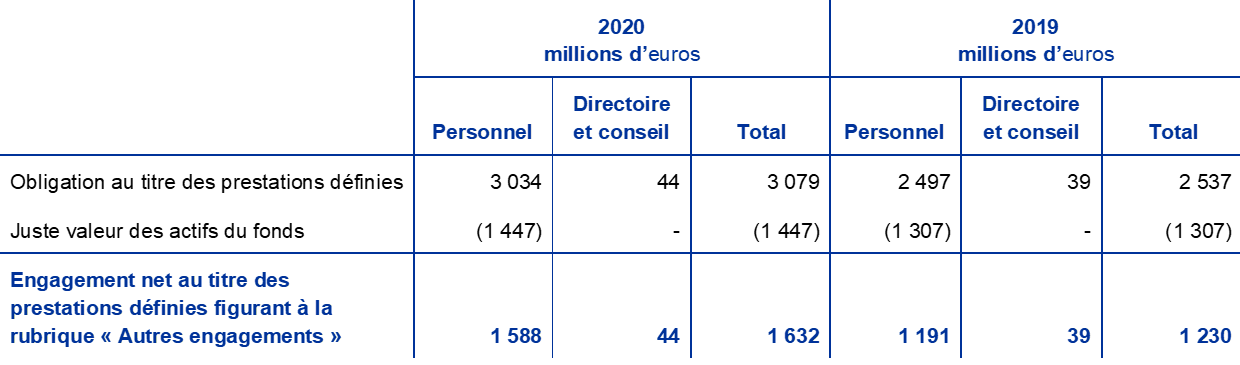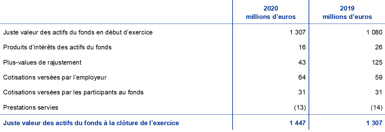 - Le régime à prestations définies n’intègre que les cotisations obligatoires versées par la BCE et les employés. Les membres du personnel ont effectué des versements supplémentaires, sur une base volontaire, dans un fonds à cotisations définies, qui se sont élevés en 2020 à 186 millions d’euros (contre 171 millions en 2019). Ces contributions sont investies dans les actifs du fonds et donnent lieu à une obligation correspondante de valeur égale.