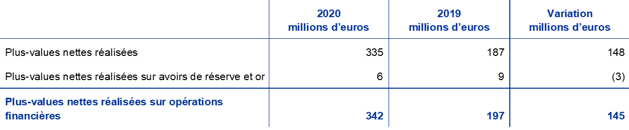 En raison du taux d’intérêt de 0 % appliqué par l’Eurosystème dans ses opérations principales de refinancement en 2020, tant le revenu d’intérêts lié à la part de la BCE dans le total des billets en euros en circulation que les charges d’intérêts liées à la rémunération des créances des BCN au titre des avoirs de réserve transférés ont été nuls.