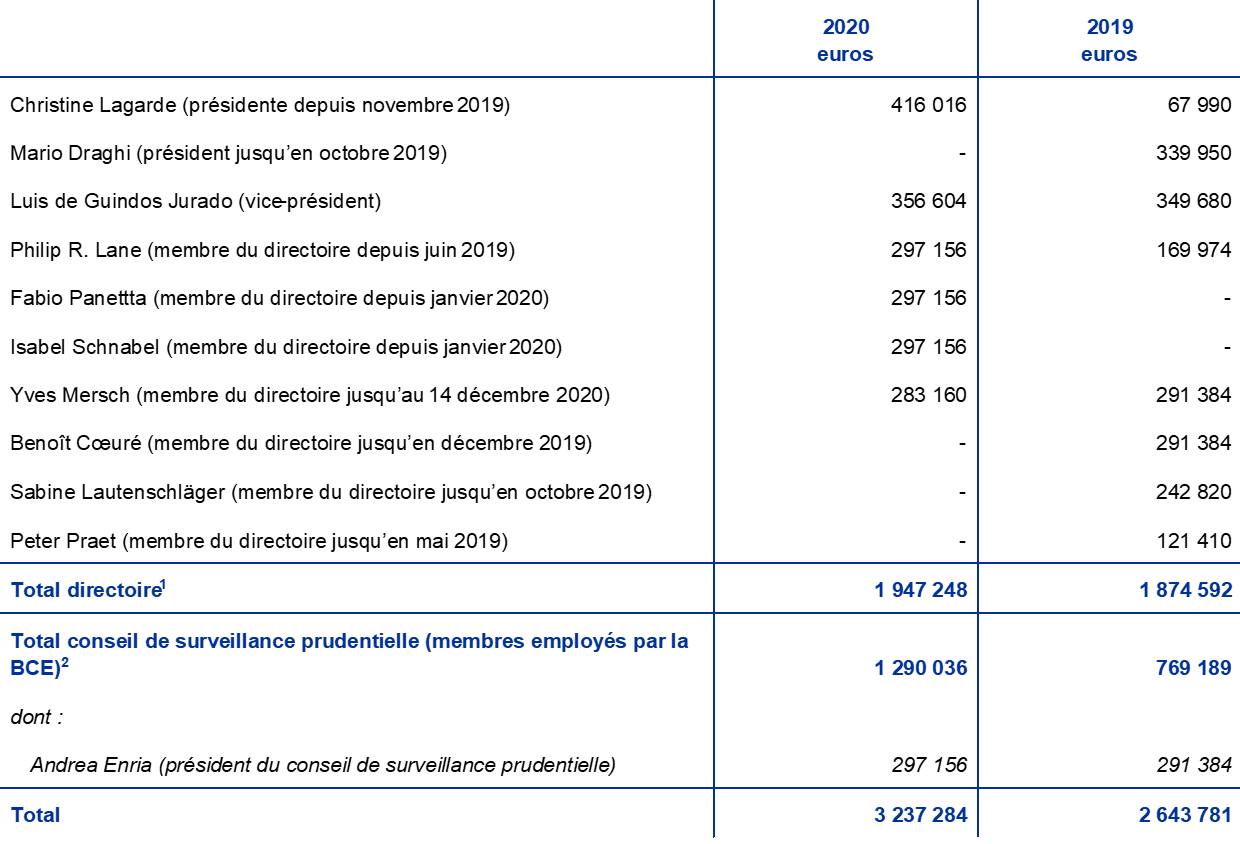 - Pour le montant net imputé au compte de résultat en ce qui concerne le régime de retraite des membres actuels du directoire et du conseil de surveillance prudentielle employés par la BCE, cf. note 13.3 « Divers ».