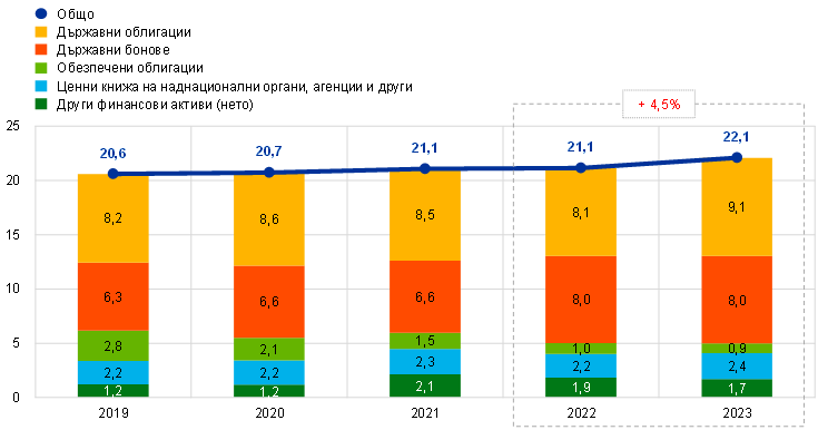 През периода 2019–2022 г. балансовото число на ЕЦБ нарасна значително, главно в резултат от окончателни покупки на ценни книжа от ЕЦБ в контекста на провеждането на паричната политика на Евросистемата (Графика 1). По-специално, основните фактори, обуславящи значителното нарастване през 2020 г. и 2021 г., бяха нетните покупки на ценни книжа по програмата за закупуване на активи (APP)[6] и въвеждането на програмата за закупуване на активи в условията на извънредна ситуация, причинена от пандемия (PEPP)[7] през март 2020 г. Нетните покупки на ценни книжа по PEPP и APP бяха преустановени съответно от края на март 2022 г. и от 1 юли 2022 г., което доведе до по-умерено нарастване на балансовото число на ЕЦБ през 2022 г.