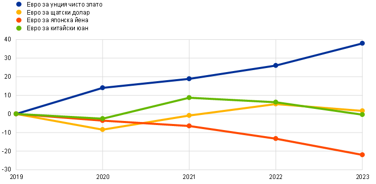 Равностойността в евро на наличностите на ЕЦБ от злато и вземания в злато се увеличи през 2023 г. с 2,7 млрд. евро до 30,4 млрд. евро (Графика 4), предимно поради нарастване на пазарната цена на златото в евро. Това нарастване доведе и до увеличение в същия размер в сметките на ЕЦБ за преоценка на златото (вижте раздел 1.3.2 „Нетен собствен капитал“). Освен това при въвеждането на единната валута в Хърватия от 1 януари 2023 г. Hrvatska narodna banka прехвърли на ЕЦБ злато на стойност 96 млн. евро.