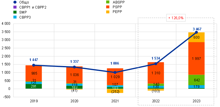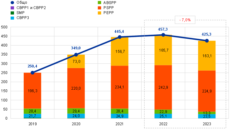 Въз основа на решения на Управителния съвет Евросистемата продължи да реинвестира изцяло погашенията по главници на ценни книжа с настъпващ падеж по PEPP през цялата година, а по APP – до края на февруари 2023 г. От началото на март до края на юни 2023 г. тя реинвестира само частично погашенията по главници на ценни книжа с настъпващ падеж по APP, а от юли 2023 г. преустанови тези реинвестиции. В резултат от тези решения портфейлът от ценни книжа, държани от ЕЦБ за целите на паричната политика, намаля с 31,9 млрд. евро до 425,3 млрд. евро (Графика 2), като държаните по APP активи от PSPP, ABSPP и CBPP3 намаляха съответно с 18,0 млрд. евро, 9,5 млрд. евро и 1,6 млрд. евро вследствие на изплащания. Портфейлът по PEPP намаля с 2,6 млрд. евро, главно в резултат от нетното въздействие на амортизацията на премии и отстъпки[8] по държани в него ценни книжа.