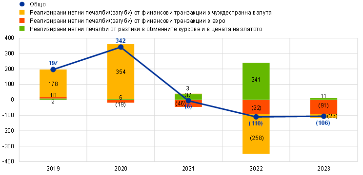 През 2023 г. общата равностойност в евро на чуждестранните резервни активи на ЕЦБ, които се състоят от злато, специални права на тираж, щатски долари, японски йени и китайски юани, се увеличи с 3,3 млрд. евро до 87,7 млрд. евро.