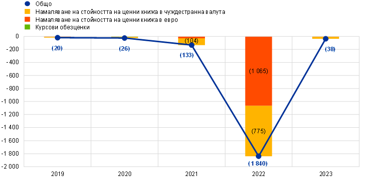 Равностойността в евро на валутните резерви на ЕЦБ[11] в щатски долари, японски йени и китайски юани нарасна с 0,2 млрд. евро до 55,2 млрд. евро (Графика 5), главно благодарение на дохода през годината, предимно по портфейла в щатски долари. В допълнение към това при въвеждането на единната валута в Хърватия, считано от 1 януари 2023 г., Hrvatska narodna banka прехвърли на ЕЦБ чуждестранни резервни активи, деноминирани в щатски долари, на стойност 544 млн. евро. Нарастването на общата стойност на наличностите в чуждестранна валута беше частично неутрализирано, най-вече от поевтиняването на щатския долар и японската йена спрямо еврото.